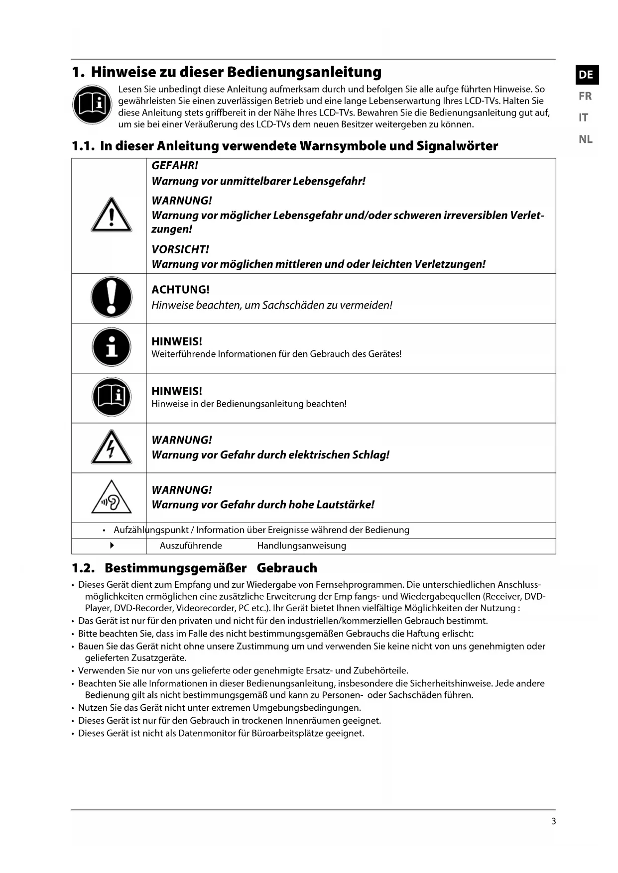 Lesen Sie unbedingt diese Anleitung aufmerksam durch und befolgen Sie alle aufge führten Hinweise. So gewährleisten Sie einen zuverlässigen Betrieb und eine lange Lebenserwartung Ihres LCD-TVs. Halten Sie diese Anleitung stets griffbereit in der Nähe Ihres LCD-TVs. Bewahren Sie die Bedienungsanleitung gut auf, um sie bei einer Veräußerung des LCD-TVs dem neuen Besitzer weitergeben zu können. 1.1. In dieser Anleitung verwendete Warnsymbole und Signalwörter GEFAHR! Warnung vor unmittelbarer Lebensgefahr! WARNUNG! Warnung vor möglicher Lebensgefahr und/oder schweren irreversiblen Verlet- zungen! VORSICHT! Warnung vor möglichen mittleren und oder leichten Verletzungen! ACHTUNG! Hinweise beachten, um Sachschäden zu vermeiden! HINWEIS! Weiterführende Informationen für den Gebrauch des Gerätes! HINWEIS! Hinweise in der Bedienungsanleitung beachten! WARNUNG! Warnung vor Gefahr durch elektrischen Schlag! WARNUNG! Warnung vor Gefahr durch hohe Lautstärke!