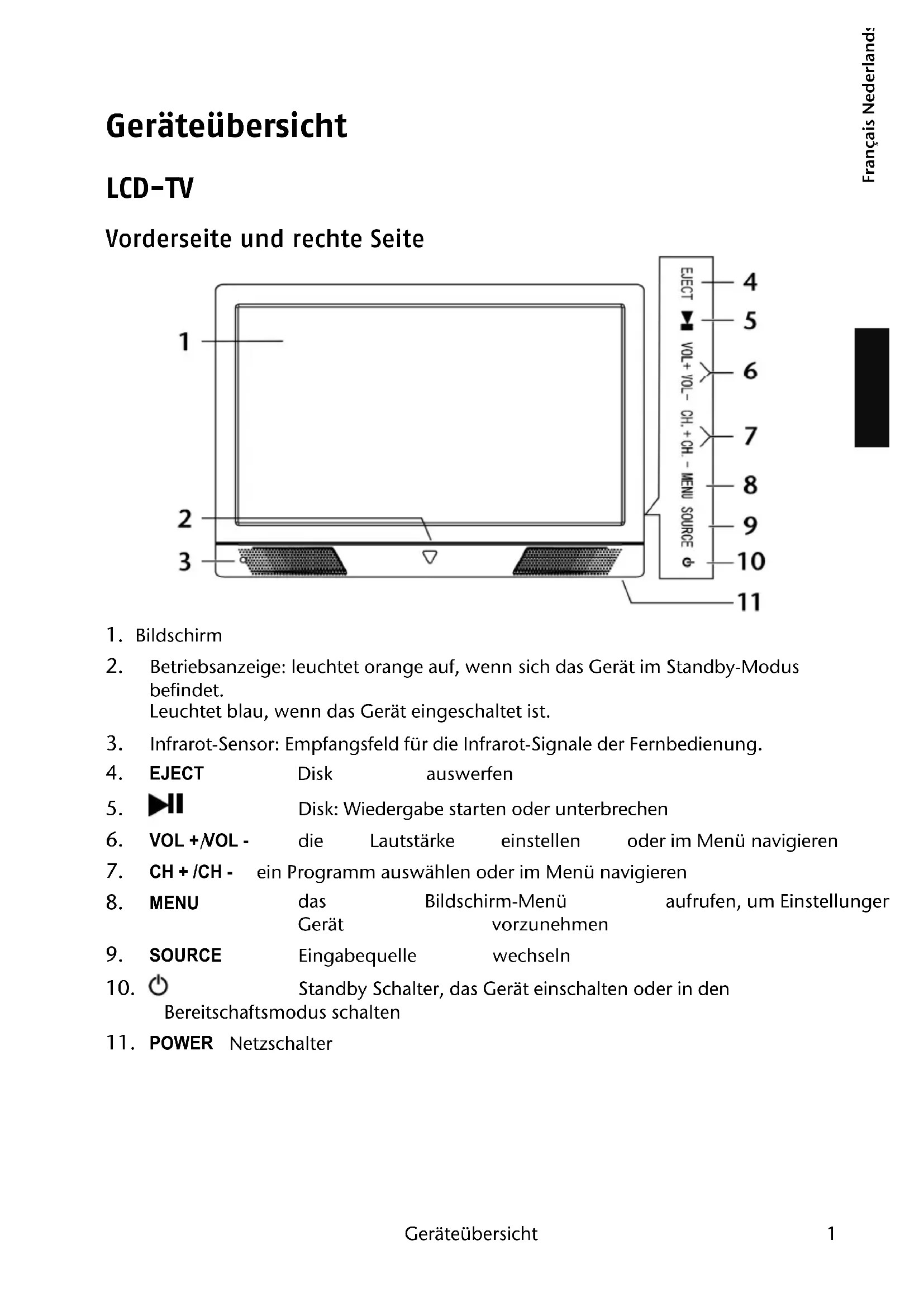 Français Nederlands Deutsch Geräteübersicht LCD-TV Vorderseite und rechte Seite