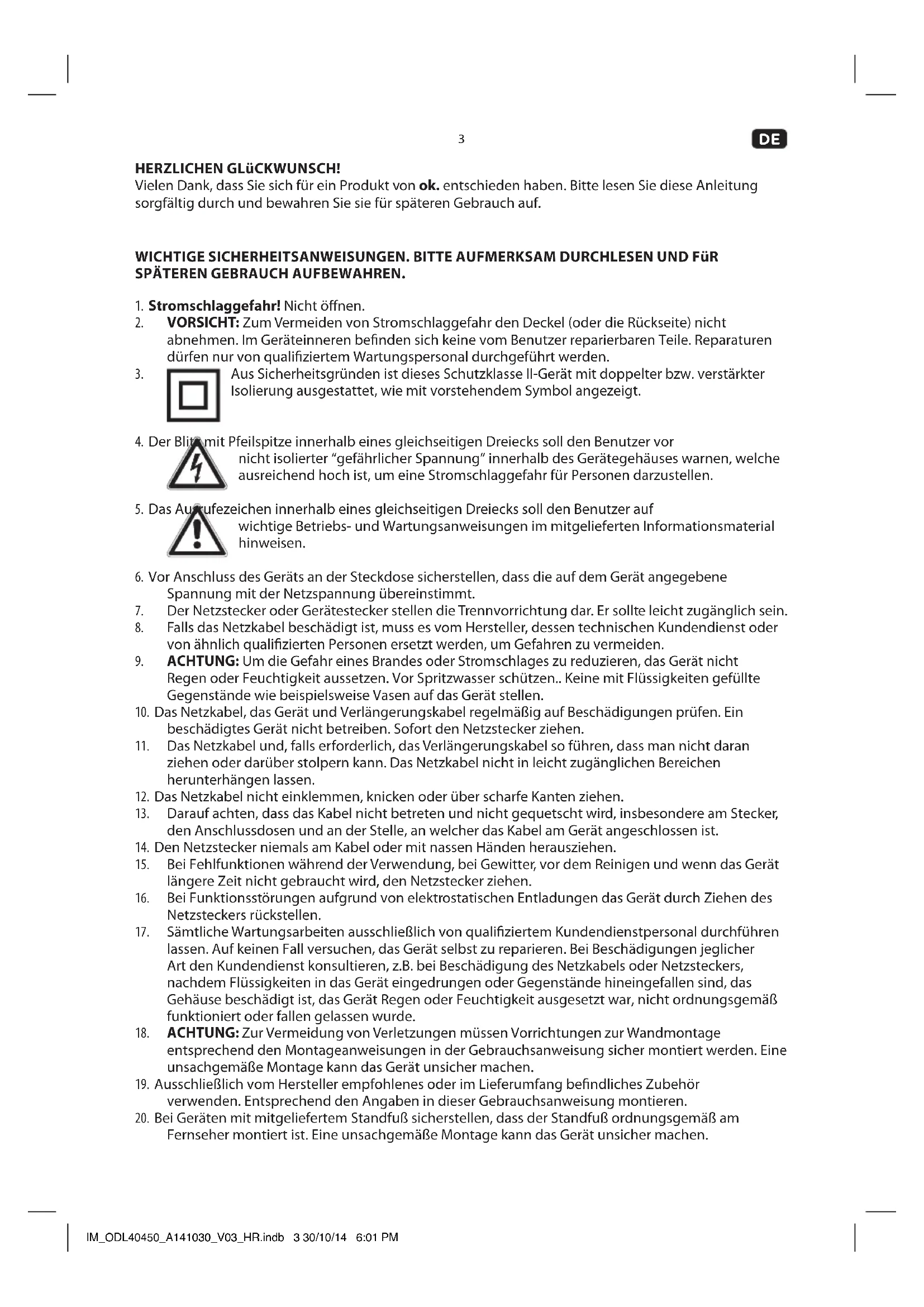 HERZLICHEN GLüCKWUNSCH! Vielen Dank, dass Sie sich für ein Produkt von ok. entschieden haben. Bitte lesen Sie diese Anleitung sorgfältig durch und bewahren Sie sie für späteren Gebrauch auf. WICHTIGE SICHERHEITSANWEISUNGEN. BITTE AUFMERKSAM DURCHLESEN UND FüR SPÄTEREN GEBRAUCH AUFBEWAHREN.