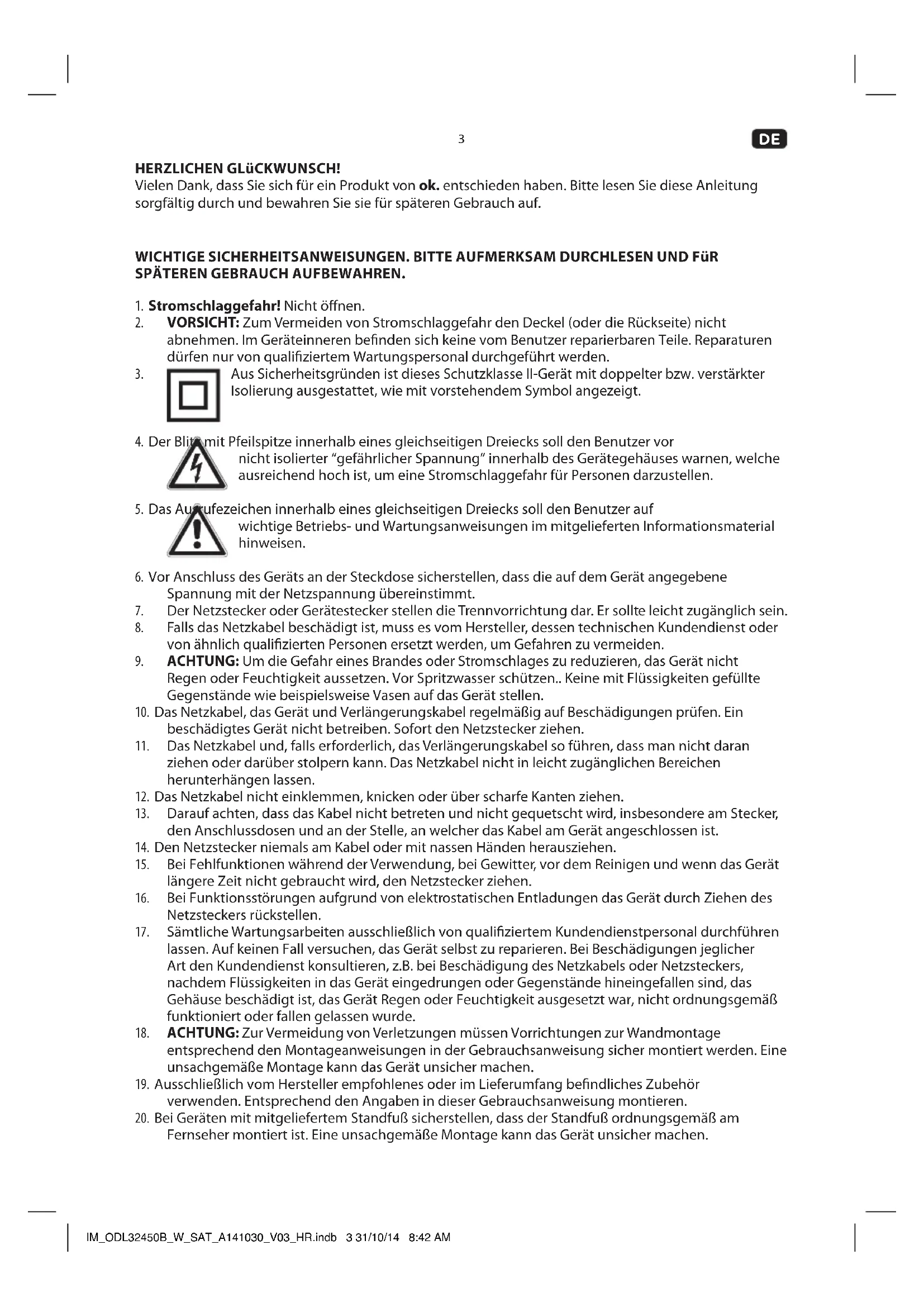 HERZLICHEN GLüCKWUNSCH! Vielen Dank, dass Sie sich für ein Produkt von ok. entschieden haben. Bitte lesen Sie diese Anleitung sorgfältig durch und bewahren Sie sie für späteren Gebrauch auf. WICHTIGE SICHERHEITSANWEISUNGEN. BITTE AUFMERKSAM DURCHLESEN UND FüR SPÄTEREN GEBRAUCH AUFBEWAHREN.