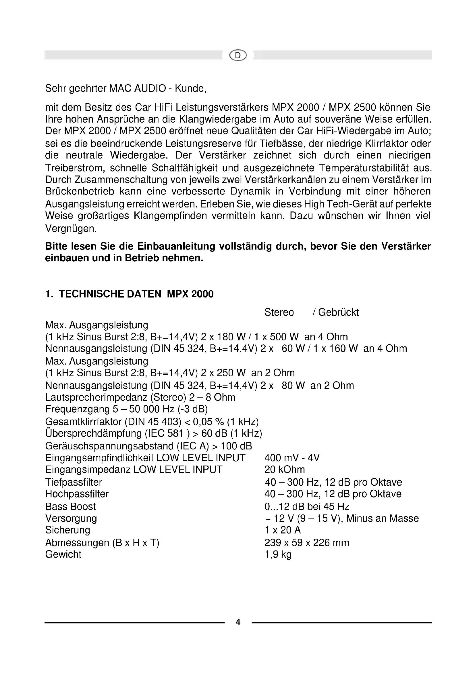 Sehr geehrter MAC AUDIO - Kunde, mit dem Besitz des Car HiFi Leistungsverstärkers MPX 2000 / MPX 2500 können Sie Ihre hohen Ansprüche an die Klangwiedergabe im Auto auf souveräne Weise erfüllen. Der MPX 2000 / MPX 2500 eröffnet neue Qualitäten der Car HiFi-Wiedergabe im Auto; sei es die beeindruckende Leistungsreserve für Tiefbässe, der niedrige Klirrfaktor oder die neutrale Wiedergabe. Der Verstärker zeichnet sich durch einen niedrigen Treiberstrom, schnelle Schaltfähigkeit und ausgezeichnete Temperaturstabilität aus. Durch Zusammenschaltung von jeweils zwei Verstärkerkanälen zu einem Verstärker im Brückenbetrieb kann eine verbesserte Dynamik in Verbindung mit einer höheren Ausgangsleistung erreicht werden. Erleben Sie, wie dieses High Tech-Gerät auf perfekte Weise großartiges Klangempfinden vermitteln kann. Dazu wünschen wir Ihnen viel Vergnügen. Bitte lesen Sie die Einbauanleitung vollständig durch, bevor Sie den Verstärker einbauen und in Betrieb nehmen.
