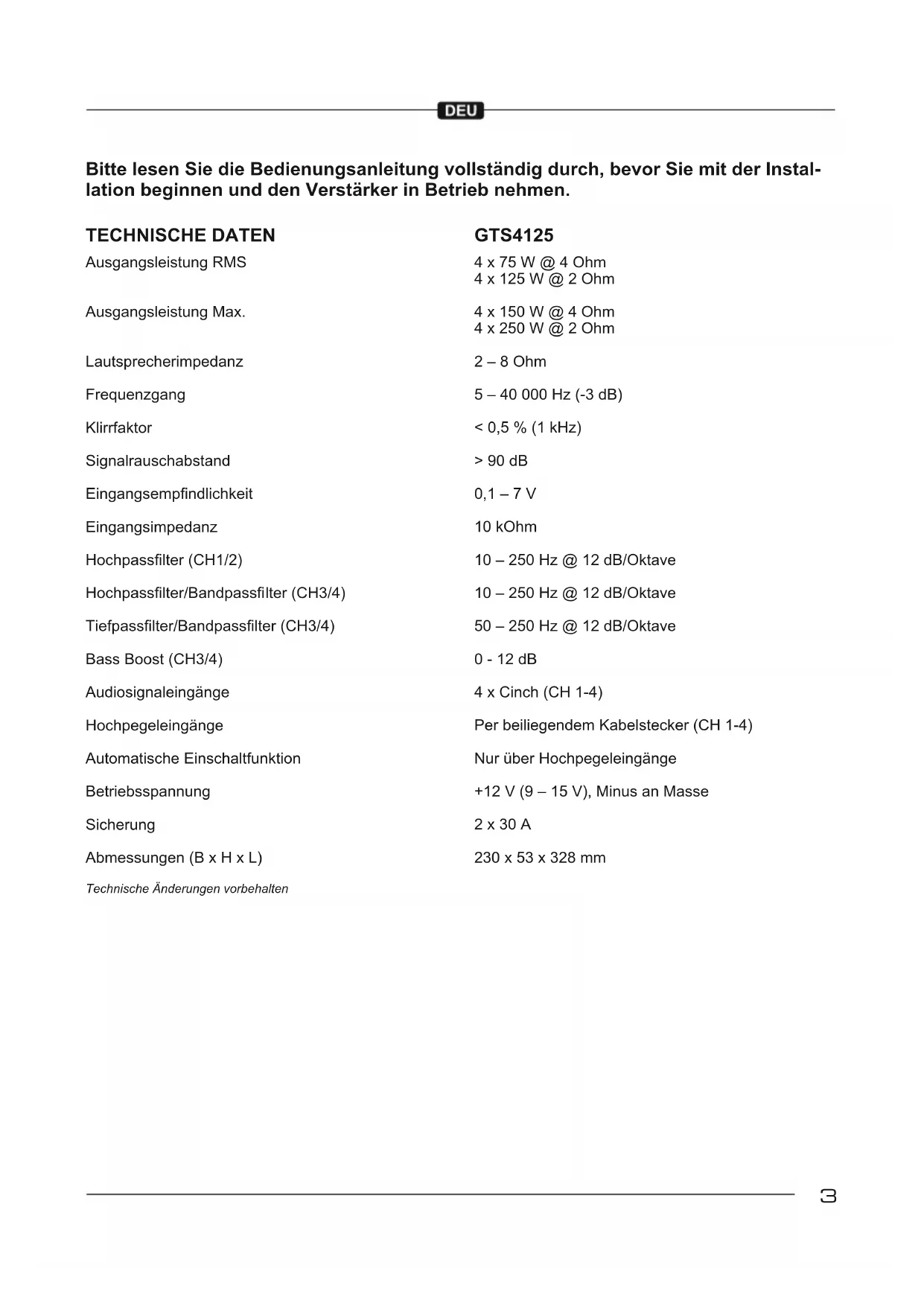 elektrischen Systems am Fahrzeug prüfen, und zwar einschließlich des Verteilers, der Zündkerzen, der Zündkerzenkabel, des Spannungsreglers usw. SCHUTZSCHALTUNG Die POWER/PROTECTION LED (Abb. 1,1) leuchtet grün auf, wenn das Gerät betriebsbereit ist. Die POWER/PROTECTION LED (Abb. 1,1) leuchtet rot auf, wenn das Gerät überhitzt ist, oder ein Kurzschluss bzw. eine zu geringe Impedanz an den Lautsprecheranschlüssen anliegt. Wenn dies eintritt, schaltet die inte- grierte Schutzschaltung den Verstärker automatisch aus. Dieser sollte nach Behebung des Problems wieder funktionieren.8 Please read the user‘s manual carefully before the installation and the rst operation of the amplier. GTS4125 4 x 75 W @ 4 Ohms 4 x 125 W @ 2 Ohms 4 x 150 W @ 4 Ohms 4 x 250 W @ 2 Ohms 2 – 8 Ohms 5 – 40 000 Hz (-3 dB) < 0,5 % (1 kHz) > 90 dB 0,1 – 7 V 10 kOhm 10 – 250 Hz @ 12 dB/Octave 10 – 250 Hz @ 12 dB/Octave 50 – 250 Hz @ 12 dB/Octave