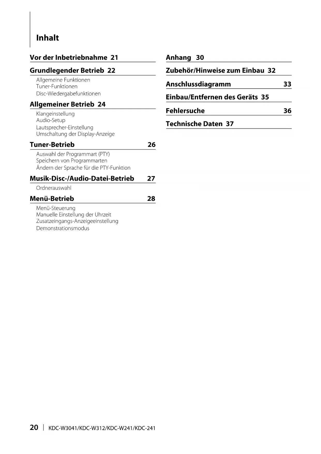 Inhalt Vor der Inbetriebnahme 21 Grundlegender Betrieb 22 Allgemeine Funktionen Tuner-Funktionen Disc-Wiedergabefunktionen Allgemeiner Betrieb 24 Klangeinstellung Audio-Setup Lautsprecher-Einstellung Umschaltung der Display-Anzeige Tuner-Betrieb 26 Auswahl der Programmart (PTY) Speichern von Programmarten Ändern der Sprache für die PTY-Funktion Musik-Disc-/Audio-Datei-Betrieb 27 Ordnerauswahl Menü-Betrieb 28 Menü-Steuerung Manuelle Einstellung der Uhrzeit Zusatzeingangs-Anzeigeeinstellung Demonstrationsmodus Anhang 30 Zubehör/Hinweise zum Einbau 32 Anschlussdiagramm 33 Einbau/Entfernen des Geräts 35 Fehlersuche 36 Technische Daten 37 TDFentryEDEUr3.indd20TDFentryEDEUr3.indd20 07.7.1111:51:29AM07.7.1111:51:29AMDeutsch