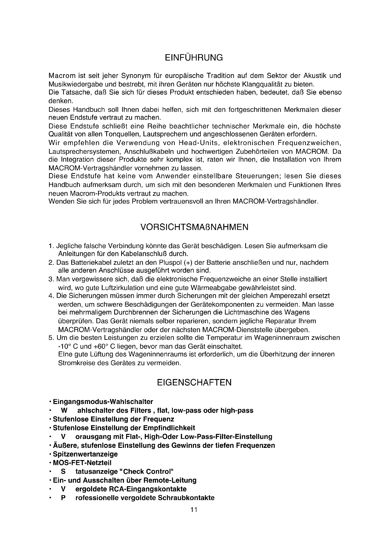 Bridged 3-channel configuration 2-channel configuration 1-channel configuration O/M ST 2.100 25/06/02 18:28 Page 910 TECHNICAL DATA Power IHF 202 500W RMS Power at (12.5 Volts DC) at 1 kHz < 0.08 % THD+N at 4 Ohm 2 x 100W at 1 kHz < 0.5 % THD+N at 2 Ohm 2 x 200W at 1 kHz < 0.5 % THD+N Mono at 4 Ohm 1 x 400W Pre-Out Sensitivity 2V High pass control, (30-600) Hz Low pass control, (30-600) Hz Crossover slope 12 dB/Octave Response in frequency +/- 1 dB 10 - 50.000 Hz Total harmonic distortion 0.08% Weighted IHF A Signal-Noise Ratio > 100 dB Input sensitivity - Impedance 200-4000 mV/22 kOhm Loudspeaker impedances Stereo min. 2 Ohms Mono min. 4 Ohms Power supply 14.4 V DC (11 - 16 V permissible) Weight 4,7 kgrs Dimensions 212(L) x 67(A) x 405(P) mm Due to the continual incorporation of improvements in this product, the characteristics and design may be subject to variation without prior notice. O/M ST 2.100 25/06/02 18:28 Page 1011 EINFÜHRUNG Macrom ist seit jeher Synonym für europäische Tradition auf dem Sektor der Akustik und Musikwiedergabe und bestrebt, mit ihren Geräten nur höchste Klangqualität zu bieten. Die Tatsache, daß Sie sich für dieses Produkt entschieden haben, bedeutet, daß Sie ebenso denken. Dieses Handbuch soll Ihnen dabei helfen, sich mit den fortgeschrittenen Merkmalen dieser neuen Endstufe vertraut zu machen. Diese Endstufe schließt eine Reihe beachtlicher technischer Merkmale ein, die höchste Qualität von allen Tonquellen, Lautsprechern und angeschlossenen Geräten erfordern. Wir empfehlen die Verwendung von Head-Units, elektronischen Frequenzweichen, Lautsprechersystemen, Anschlußkabeln und hochwertigen Zubehörteilen von MACROM. Da die Integration dieser Produkte sehr komplex ist, raten wir Ihnen, die Installation von Ihrem MACROM-Vertragshändler vornehmen zu lassen. Diese Endstufe hat keine vom Anwender einstellbare Steuerungen; lesen Sie dieses Handbuch aufmerksam durch, um sich mit den besonderen Merkmalen und Funktionen Ihres neuen Macrom-Produkts vertraut zu machen. Wenden Sie sich für jedes Problem vertrauensvoll an Ihren MACROM-Vertragshändler. VORSICHTSMAßNAHMEN