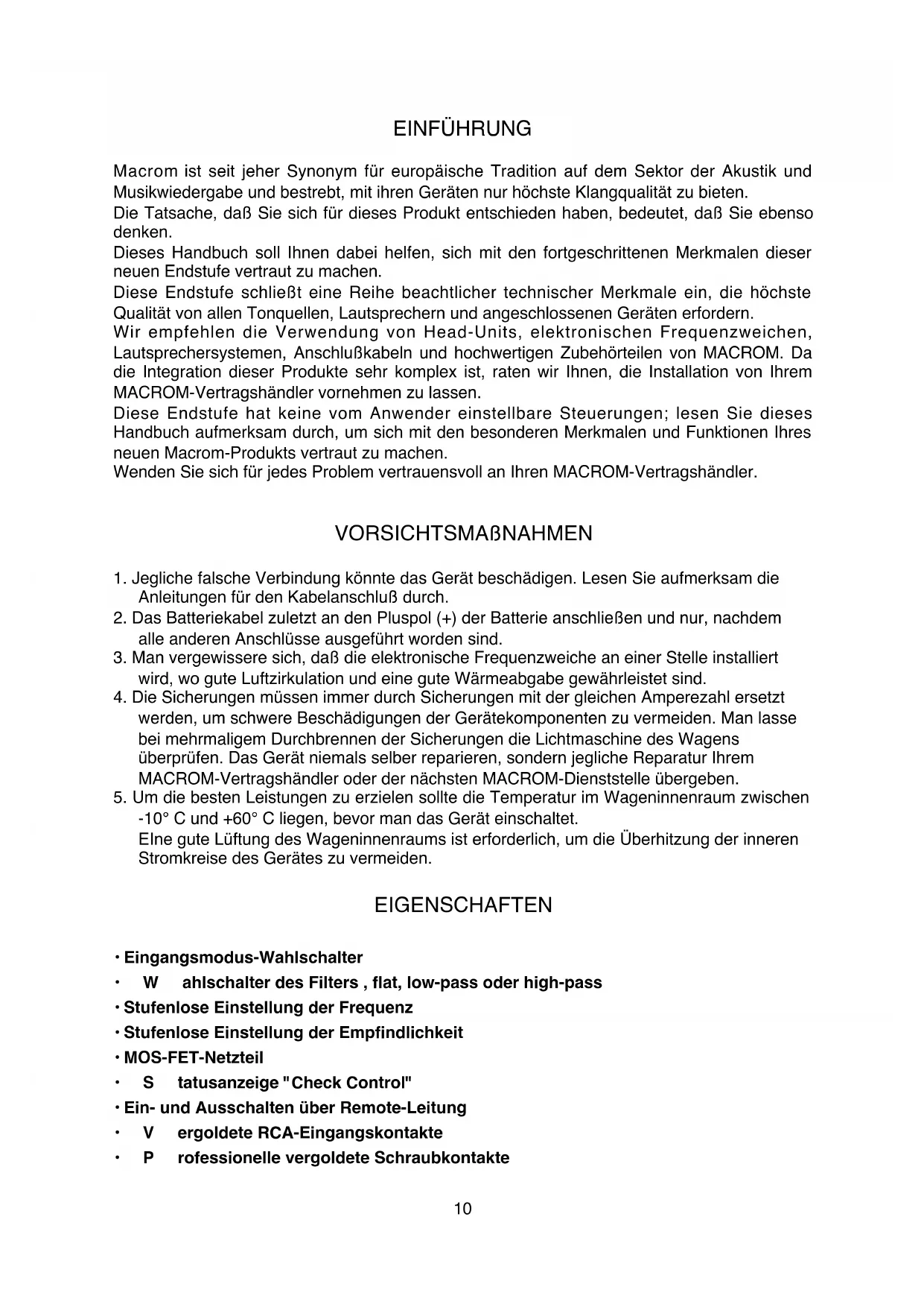 Bridged 3-channel configuration 2-channel configuration 1-channel configuration O/M SP 2.050x 25/06/02 17:44 Page 89 TECHNICAL DATA Power IHF 202 250 W RMS Power at (12.5 Volts DC) at 1 kHz < 0.08 % THD at 4 Ohm 2 x 55 W at 1 kHz < 0.5 % THD at 2 Ohm 2 x 80 W at 1 kHz < 0.5 % THD Mono at 4 Ohm 1 x 160 W Dynamic Power at (14.4 Volts DC) at 1 kHz < 0.08 % THD at 4 Ohm 2 x 60 W at 1 kHz < 0.5 % THD at 2 Ohm 2 x 100 W at 1 kHz < 0.5 % THD Mono at 4 Ohm 1 x 200 W High pass control, (30-600) Hz Low pass control, (30-600) Hz Crossover slope 12 dB/Octave Response in frequency +/- 1 dB 10 - 50.000 Hz Total harmonic distortion 0.08% Weighted IHF A Signal-Noise Ratio > 100 dB Input sensitivity - Impedance 200-4000 mV/22 kOhm Loudspeaker impedances Stereo min. 2 Ohms Mono min. 4 Ohms Power supply 14.4 V DC (11 - 16 V permissible) Weight 2,4 kgrs Dimensions 212(i) x 65(h) x 225(p) mm Due to the continual incorporation of improvements in this product, the characteristics and design may be subject to variation without prior notice. O/M SP 2.050x 25/06/02 17:44 Page 910 EINFÜHRUNG Macrom ist seit jeher Synonym für europäische Tradition auf dem Sektor der Akustik und Musikwiedergabe und bestrebt, mit ihren Geräten nur höchste Klangqualität zu bieten. Die Tatsache, daß Sie sich für dieses Produkt entschieden haben, bedeutet, daß Sie ebenso denken. Dieses Handbuch soll Ihnen dabei helfen, sich mit den fortgeschrittenen Merkmalen dieser neuen Endstufe vertraut zu machen. Diese Endstufe schließt eine Reihe beachtlicher technischer Merkmale ein, die höchste Qualität von allen Tonquellen, Lautsprechern und angeschlossenen Geräten erfordern. Wir empfehlen die Verwendung von Head-Units, elektronischen Frequenzweichen, Lautsprechersystemen, Anschlußkabeln und hochwertigen Zubehörteilen von MACROM. Da die Integration dieser Produkte sehr komplex ist, raten wir Ihnen, die Installation von Ihrem MACROM-Vertragshändler vornehmen zu lassen. Diese Endstufe hat keine vom Anwender einstellbare Steuerungen; lesen Sie dieses Handbuch aufmerksam durch, um sich mit den besonderen Merkmalen und Funktionen Ihres neuen Macrom-Produkts vertraut zu machen. Wenden Sie sich für jedes Problem vertrauensvoll an Ihren MACROM-Vertragshändler. VORSICHTSMAßNAHMEN
