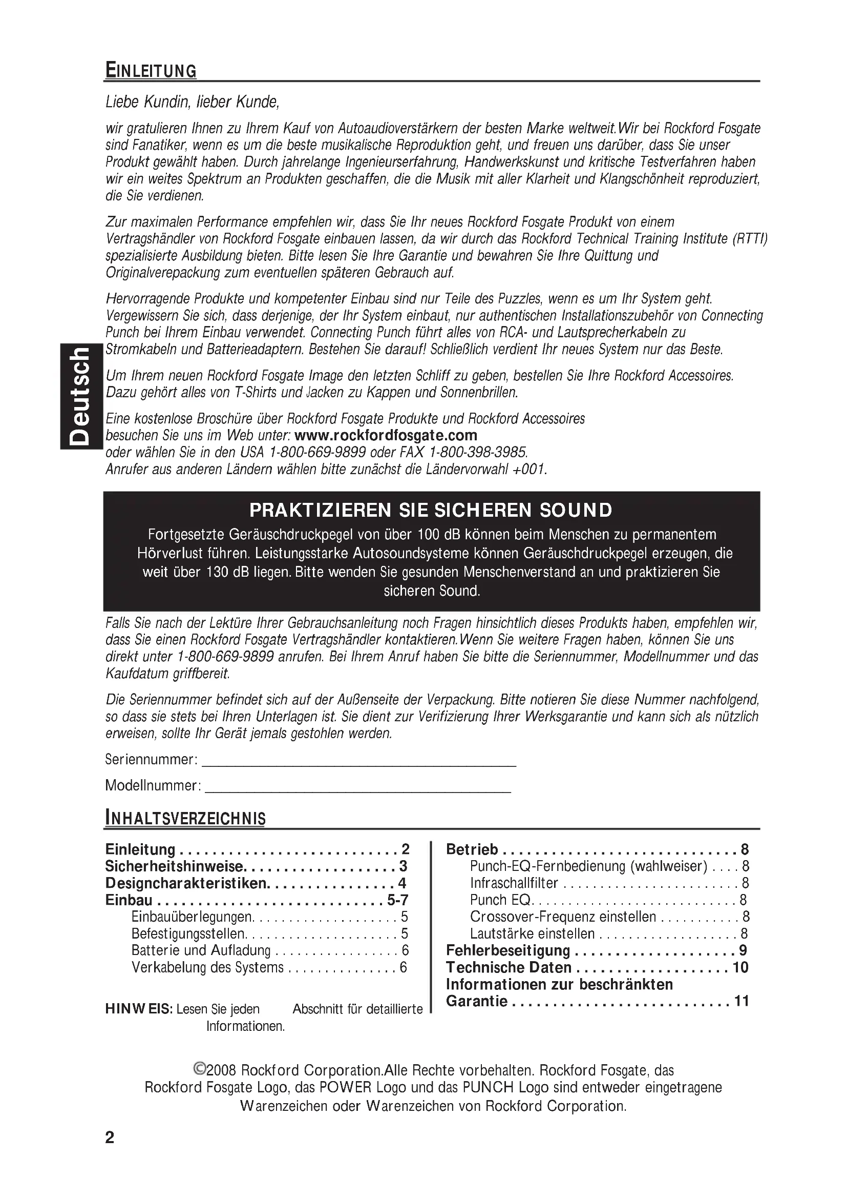 Falls Sie nach der Lektüre Ihrer Gebrauchsanleitung noch Fragen hinsichtlich dieses Produkts haben, empfehlen wir, dass Sie einen Rockford Fosgate Vertragshändler kontaktieren. Wenn Sie weitere Fragen haben, können Sie uns direkt unter 1-800-669-9899 anrufen. Bei Ihrem Anruf haben Sie bitte die Seriennummer, Modellnummer und das Kaufdatum griffbereit.
