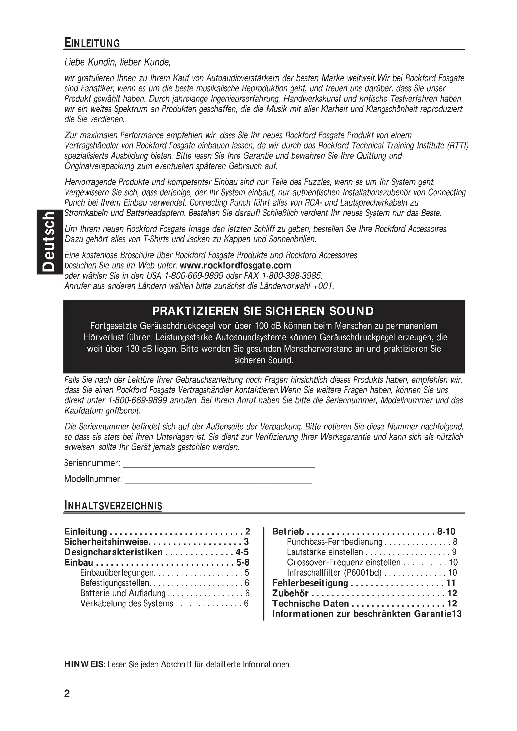 Falls Sie nach der Lekture ihrer Gebrauchsanleitung noch Fragen hinsichtlich thesees Produkts haben, empfehlen wir, dass Sie einen Rockford Fosgate Vertragshandler kontaktieren. Wenn Sie weitere Fragen haben, konnen Sie uns direkt unter 1-800-669-9899 anrufen. Bei Ihr dem Anruf haben Sieitte die Seriennummer, Modellnummer und das Kaufdatum griffbereit.