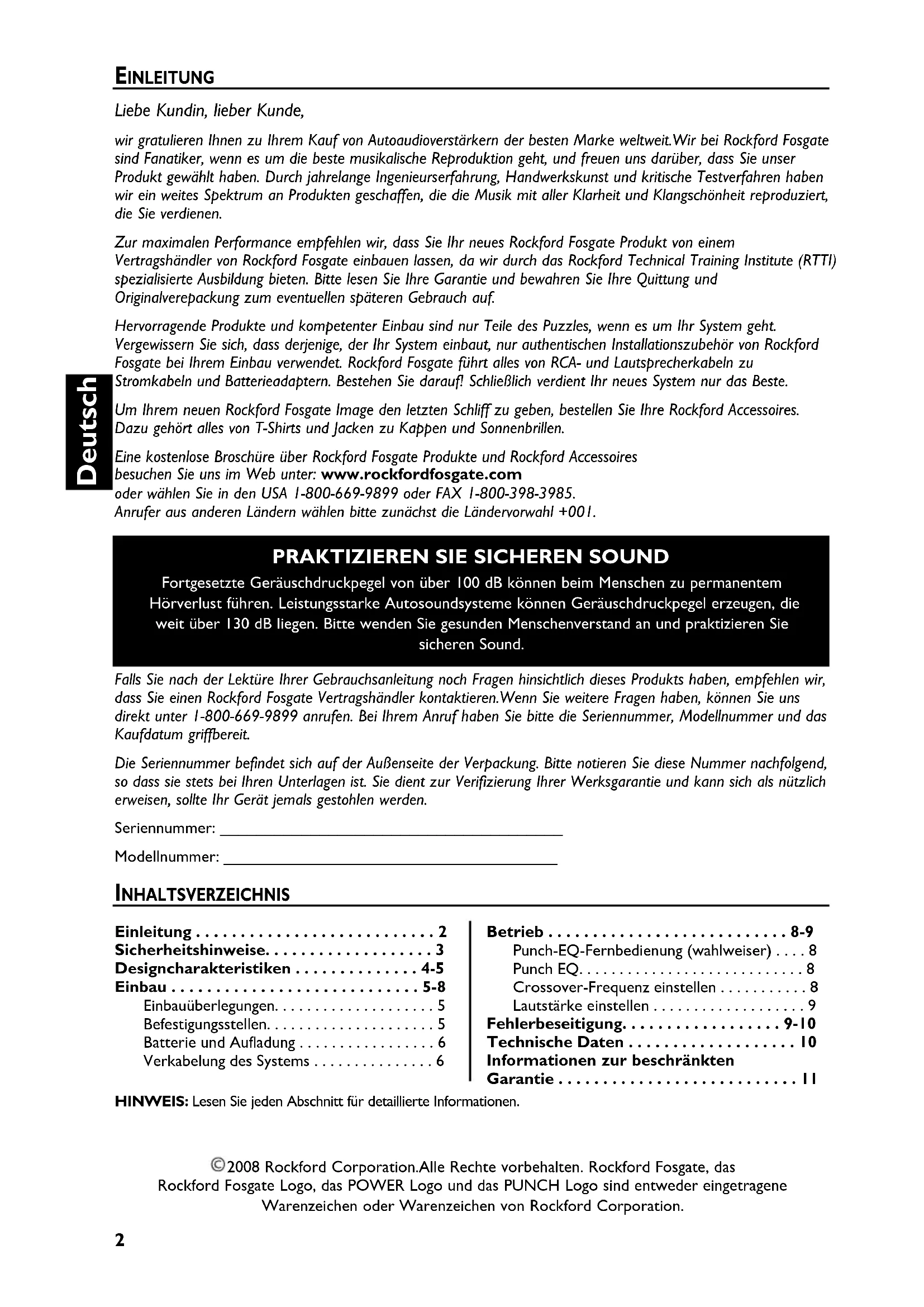 Willkommen bei Rockford Fosgate! Diese Anleitung bietet dem Besitzer, Verkauf der Einbauenden Informationen. Kurzgefasse Informationen zum Einbau these Products finden sich im Abschnitt „Einbau" dieser Anleitung. Andere Informationen konnen Sie mithilfe des Inhaltsverzeichnisses auffinden. Wir bei Rockford Fosgate haben uns sehr darum bemührt, dass alle in dieser Anleitung enthaltenen Informationen auf dem neusten Stand sind. Da wir unsere Produkte bereits ständig weiterentwickeln, konnen sich diese Informationen bereits ohne Ankündigung ändern.