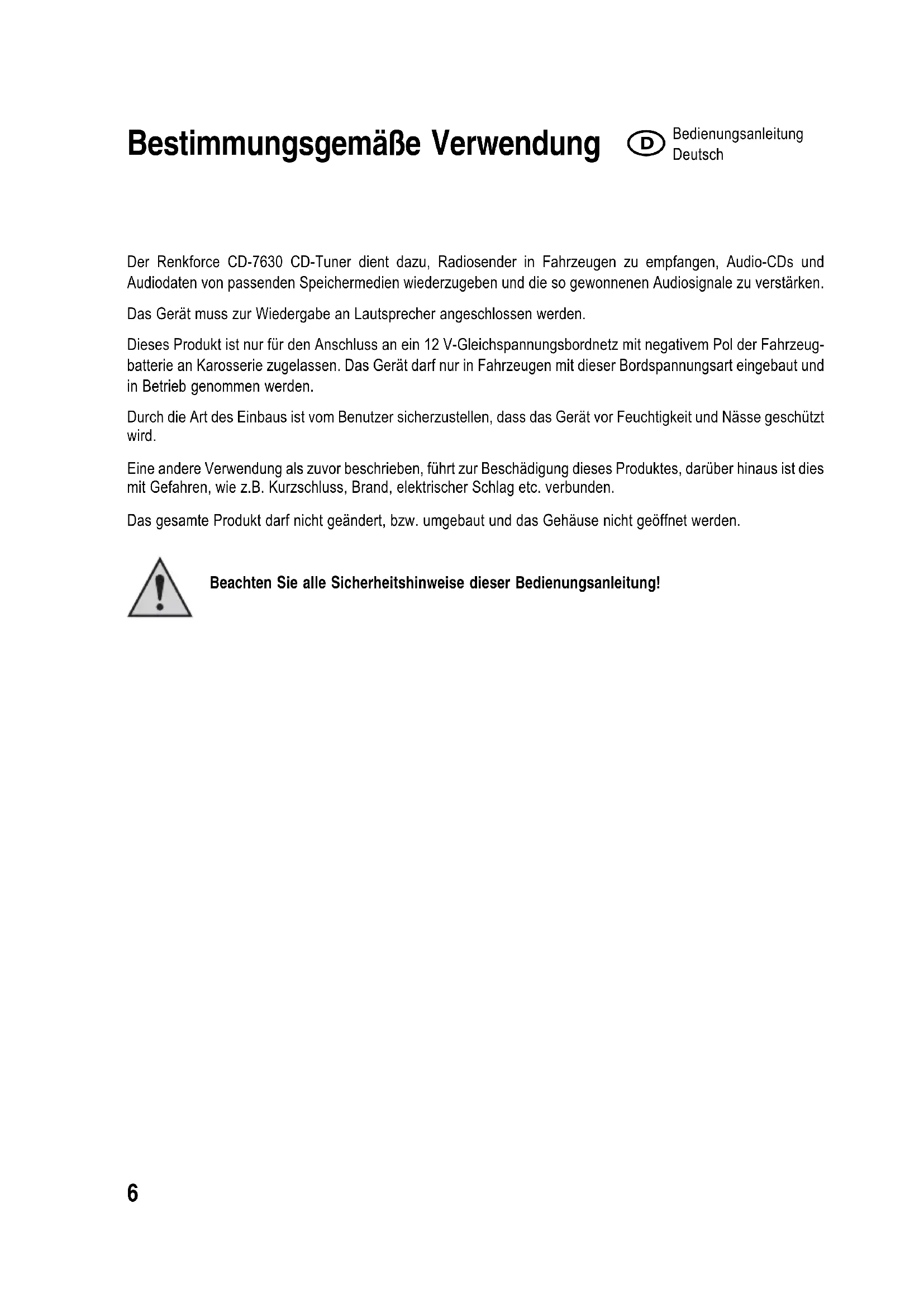 Dieses Produkt ist nur für den Anschluss an ein 12 V-Gleichspannungsbordnetz mit negativem Pol der Fahrzeugbatterie an Karosserie zugelassen. Das Gerätarf nur in Fahrzeugen mit dieser Bordspannungsart eingebaut und in Betrieb genommen werden.