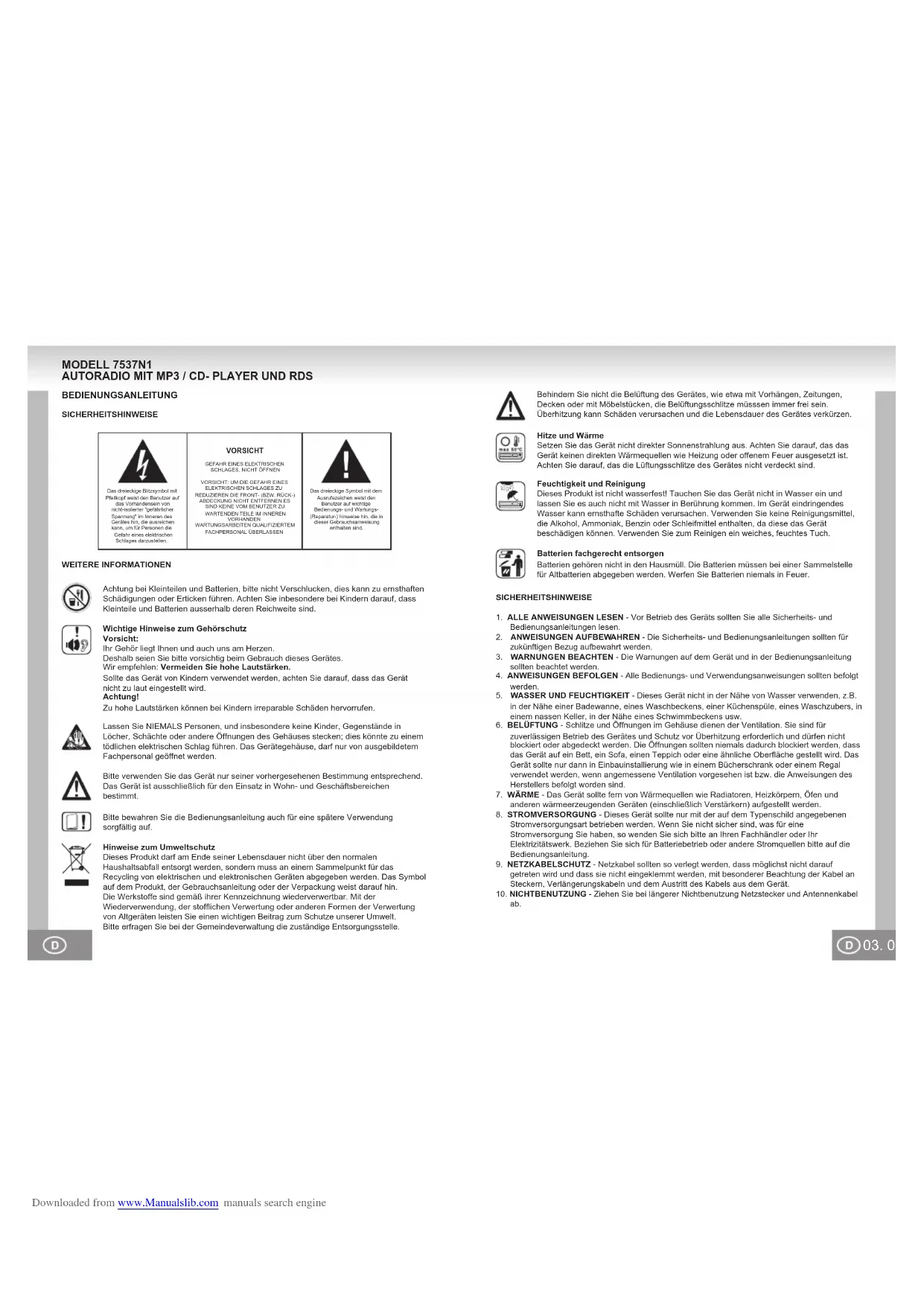 Downloaded from www.Manualslib.com manuals search engine03. 02. Bitte verwenden Sie das Gerät nur seiner vorhergesehenen Bestimmung entsprechend.Das Gerät ist ausschließlich für den Einsatz in Wohn- und Geschäftsbereichen bestimmt.Bitte bewahren Sie die Bedienungsanleitung auch für eine spätere Verwendung sorgfältig auf.BEDIENUNGSANLEITUNGSICHERHEITSHINWEISEWEITERE INFORMATIONENLassen Sie NIEMALS Personen, und insbesondere keine Kinder, Gegenstände in Löcher, Schächte oder andere Öffnungen des Gehäuses stecken; dies könnte zu einem tödlichen elektrischen Schlag führen. Das Gerätegehäuse, darf nur von ausgebildetem Fachpersonal geöffnet werden.Hinweise zum UmweltschutzDieses Produkt darf am Ende seiner Lebensdauer nicht über den normalen Haushaltsabfall entsorgt werden, sondern muss an einem Sammelpunkt für das Recycling von elektrischen und elektronischen Geräten abgegeben werden. Das Symbol auf dem Produkt, der Gebrauchsanleitung oder der Verpackung weist darauf hin.Die Werkstoffe sind gemäß ihrer Kennzeichnung wiederverwertbar. Mit der Wiederverwendung, der stofflichen Verwertung oder anderen Formen der Verwertung von Altgeräten leisten Sie einen wichtigen Beitrag zum Schutze unserer Umwelt.Bitte erfragen Sie bei der Gemeindeverwaltung die zuständige Entsorgungsstelle.Behindern Sie nicht die Belüftung des Gerätes, wie etwa mit Vorhängen, Zeitungen, Decken oder mit Möbelstücken, die Belüftungsschlitze müsssen immer frei sein. Überhitzung kann Schäden verursachen und die Lebensdauer des Gerätes verkürzen.Hitze und WärmeSetzen Sie das Gerät nicht direkter Sonnenstrahlung aus. Achten Sie darauf, das das Gerät keinen direkten Wärmequellen wie Heizung oder offenem Feuer ausgesetzt ist. Achten Sie darauf, das die Lüftungsschlitze des Gerätes nicht verdeckt sind.Feuchtigkeit und ReinigungDieses Produkt ist nicht wasserfest! Tauchen Sie das Gerät nicht in Wasser ein und lassen Sie es auch nicht mit Wasser in Berührung kommen. Im Gerät eindringendes Wasser kann ernsthafte Schäden verursachen. Verwenden Sie keine Reinigungsmittel, die Alkohol, Ammoniak, Benzin oder Schleifmittel enthalten, da diese das Gerät beschädigen können. Verwenden Sie zum Reinigen ein weiches, feuchtes Tuch.Das dreieckige Blitzsymbol mit Pfeilkopf weist den Benutzer auf das Vorhandensein von nicht-isolierter "gefährlicher Spannung" im Inneren des Gerätes hin, die ausreichen kann, um für Personen die Gefahr eines elektrischen Schlages darzustellen.Das dreieckige Symbol mit dem Ausrufezeichen weist den Benutzer auf wichtige Bedienungs- und Wartungs- (Reparatur-) hinweise hin, die in dieser Gebrauchsanweisung enthalten sind.VORSICHTGEFAHR EINES ELEKTRISCHEN SCHLAGES, NICHT ÖFFNENVORSICHT: UM DIE GEFAHR EINES ELEKTRISCHEN SCHLAGES ZU REDUZIEREN DIE FRONT- (BZW. RÜCK-) ABDECKUNG NICHT ENTFERNEN ES SIND KEINE VOM BENUTZER ZU WARTENDEN TEILE IM INNEREN VORHANDENWARTUNGSARBEITEN QUALIFIZIERTEM FACHPERSONAL ÜBERLASSENAchtung bei Kleinteilen und Batterien, bitte nicht Verschlucken, dies kann zu ernsthaften Schädigungen oder Erticken führen. Achten Sie inbesondere bei Kindern darauf, dass Kleinteile und Batterien ausserhalb deren Reichweite sind.Wichtige Hinweise zum GehörschutzVorsicht:Ihr Gehör liegt Ihnen und auch uns am Herzen.Deshalb seien Sie bitte vorsichtig beim Gebrauch dieses Gerätes.Wir empfehlen: Vermeiden Sie hohe Lautstärken.Sollte das Gerät von Kindern verwendet werden, achten Sie darauf, dass das Gerät nicht zu laut eingestellt wird.Achtung!Zu hohe Lautstärken können bei Kindern irreparable Schäden hervorrufen.Batterien fachgerecht entsorgenBatterien gehören nicht in den Hausmüll. Die Batterien müssen bei einer Sammelstelle für Altbatterien abgegeben werden. Werfen Sie Batterien niemals in Feuer. MODELL 7537N1 AUTORADIO MIT MP3 / CD- PLAYER UND RDS SICHERHEITSHINWEISE1. ALLE ANWEISUNGEN LESEN - Vor Betrieb des Geräts sollten Sie alle Sicherheits- und Bedienungsanleitungen lesen.