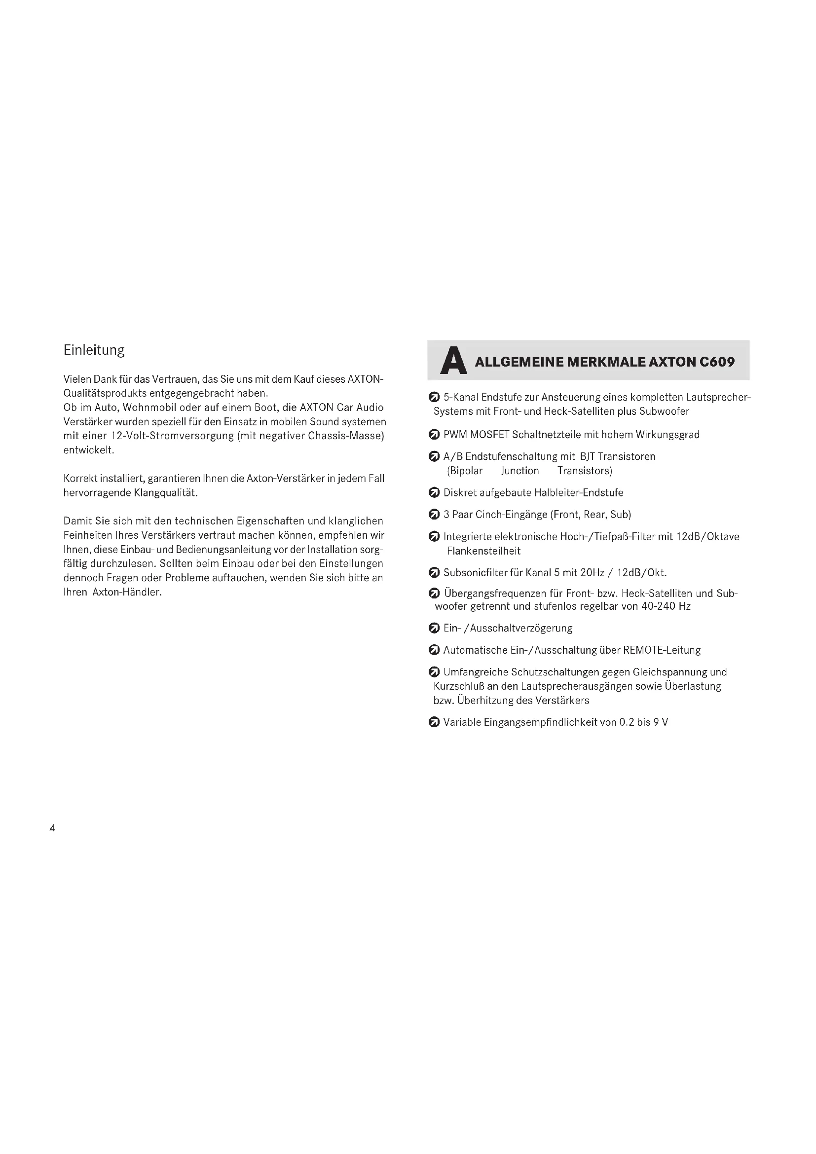 Damit Sie sich mit den technischen Eigenschaften und klanglichen Feinheiten Ihres Verstärkers vertraut machen konnen, empfehlen wir Ihnen, diese Einbau- und Bedienungsanleitung vor der Installation sorgfällig durchzULEsen. Sollten beim Einbau oder bei den Einstellungen dennoch Fragen oder Probleme auftauchen, wenden Sie sichitte an ihren Axton-Handler.