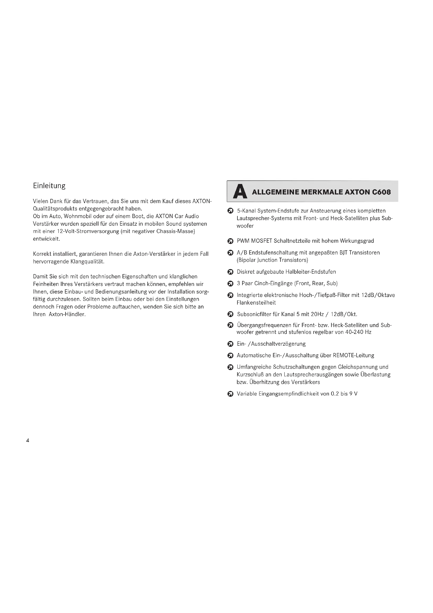 Damit Sie sich mit den technischen Eigenschaften und klanglichen Feinheiten Ihres Verstärkers vertraut machen können, empfehlen wir Ihnen, diese Einbau- und Bedienungsanleitung vor der Installation sorgfältig durchzulesen. Sollten beim Einbau oder bei den Einstellungen dennoch Fragen oder Probleme auftauchen, wenden Sie sich bitte an Ihren Axton-Händler.