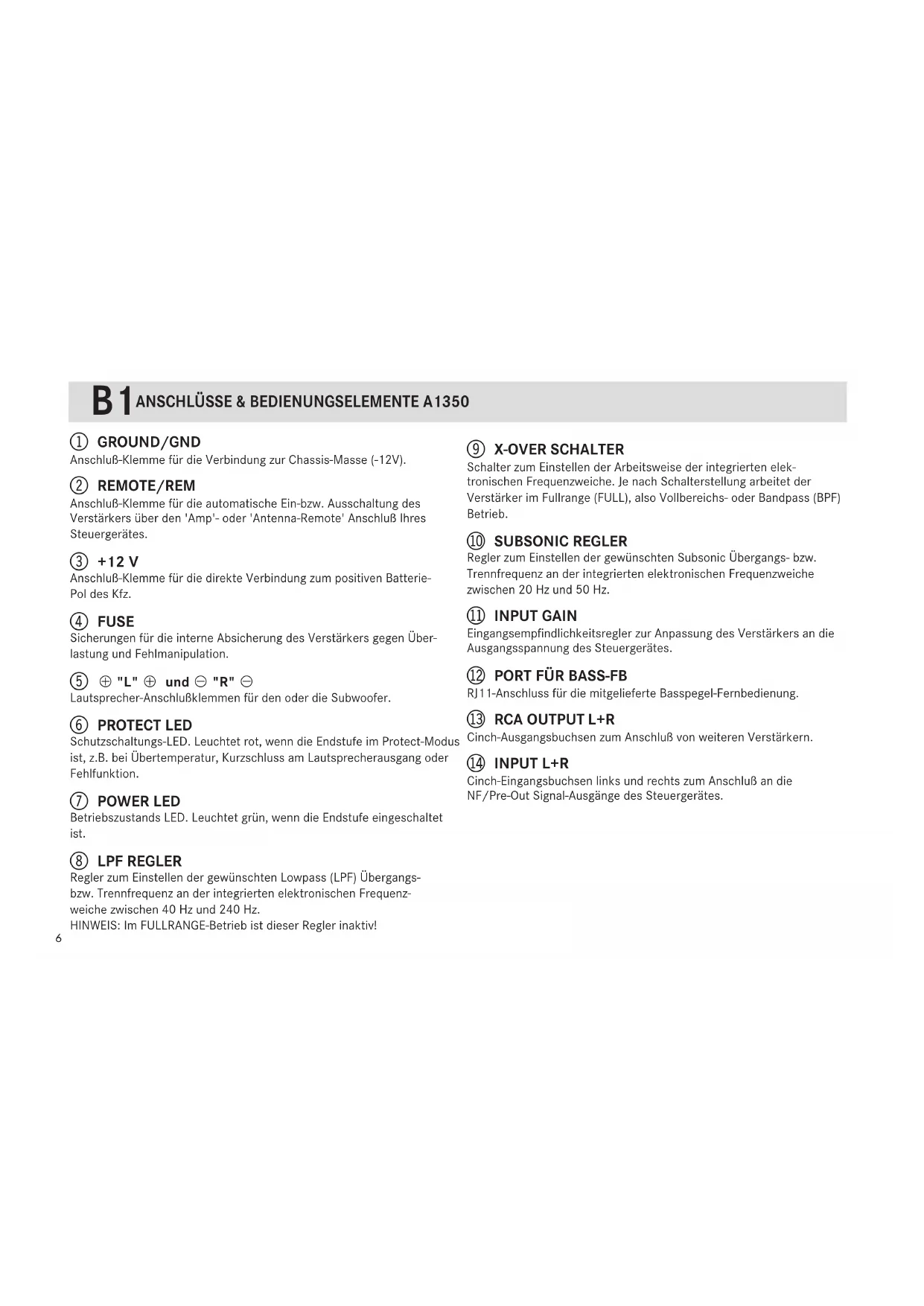 SchalterzumEinstellenderArbeitsweisederintegriertenelek-tronischenFrequenzweiche.JenachSchalterstellungarbeitetderVerstärkerimFullrange(FULL),alsoVollbereichs-oderBandpass(BPF)Betrieb. ReglerzumEinstellendergewünschtenSubsonicÜbergangs-bzw.TrennfrequenzanderintegriertenelektronischenFrequenzweichezwischen20Hzund50Hz. EingangsempfindlichkeitsreglerzurAnpassungdesVerstärkersandieAusgangsspannungdesSteuergerätes. RJ11-AnschlussfürdiemitgelieferteBasspegel-Fernbedienung. Cinch-AusgangsbuchsenzumAnschlußvonweiterenVerstärkern. Cinch-EingangsbuchsenlinksundrechtszumAnschlußandieNF/Pre-OutSignal-AusgängedesSteuergerätes. Anschluß-KlemmefürdieVerbindungzurChassis-Masse(-12V). Anschluß-KlemmefürdieautomatischeEin-bzw.AusschaltungdesVerstärkersüberden'Amp'-oder'Antenna-Remote'AnschlußIhresSteuergerätes. Anschluß-KlemmefürdiedirekteVerbindungzumpositivenBatterie-PoldesKfz. SicherungenfürdieinterneAbsicherungdesVerstärkersgegenÜber-lastungundFehlmanipulation. 5 A A Lautsprecher-AnschlußklemmenfürdenoderdieSubwoofer. Schutzschaltungs-LED.Leuchtetrot,wenndieEndstufeimProtect-Modusist,z.B.beiÜbertemperatur,KurzschlussamLautsprecherausgangoderFehlfunktion. BetriebszustandsLED.Leuchtetgrün,wenndieEndstufeeingeschaltet ist.