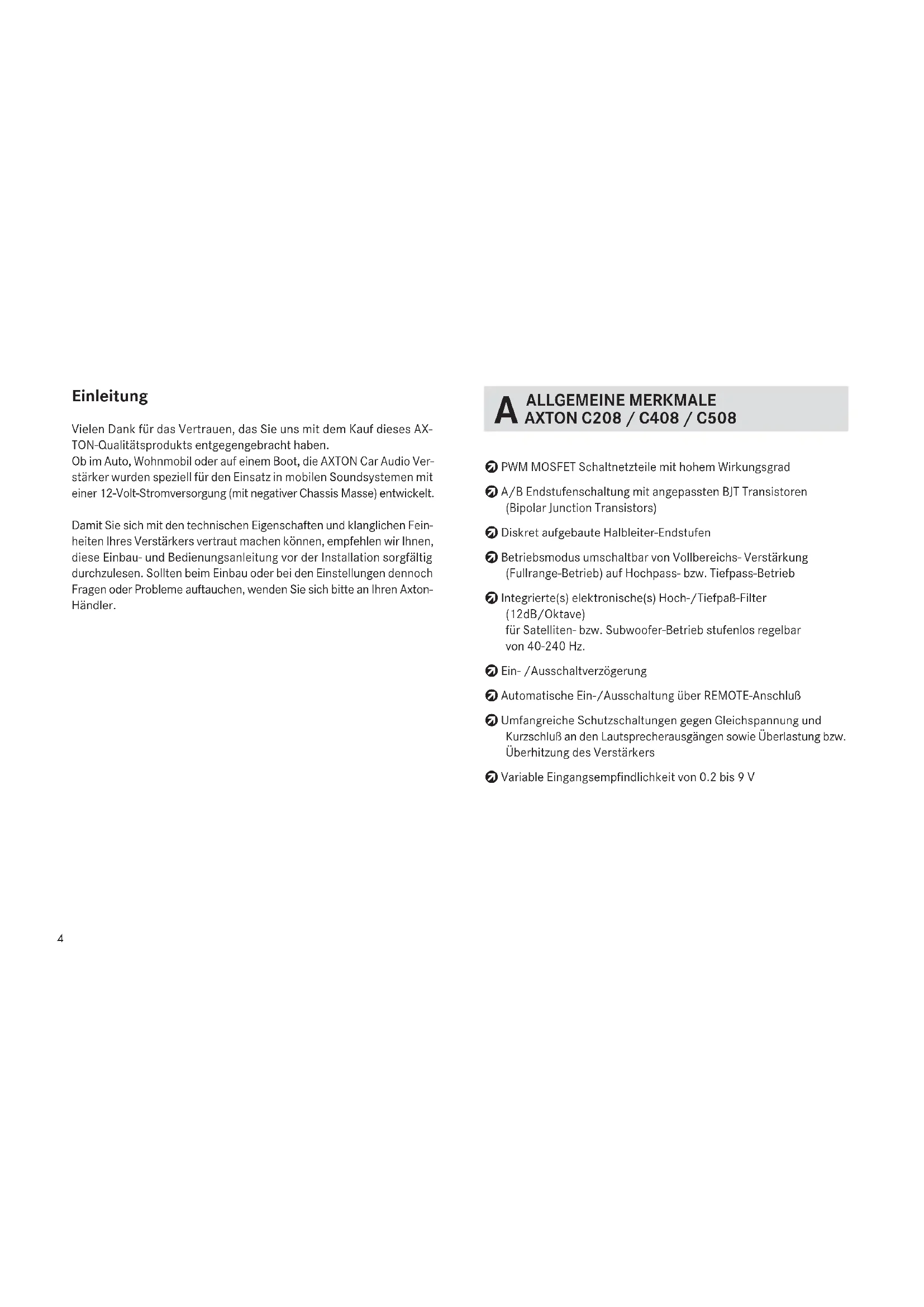 Damit Sie sich mit den technischen Eigenschaften und klanglichen Feinheiten Ihres Verstärkers vertraut machen können, empfehlen wir Ihnen, diese Einbau- und Bedienungsanleitung vor der Installation sorgfältig durchzulesen. Sollen beim Einbau oder bei den Einstellungen-DDnoch Fragen oder Probleme auftauchen, wenden Sie sichitte an ihren AxtonHandler.