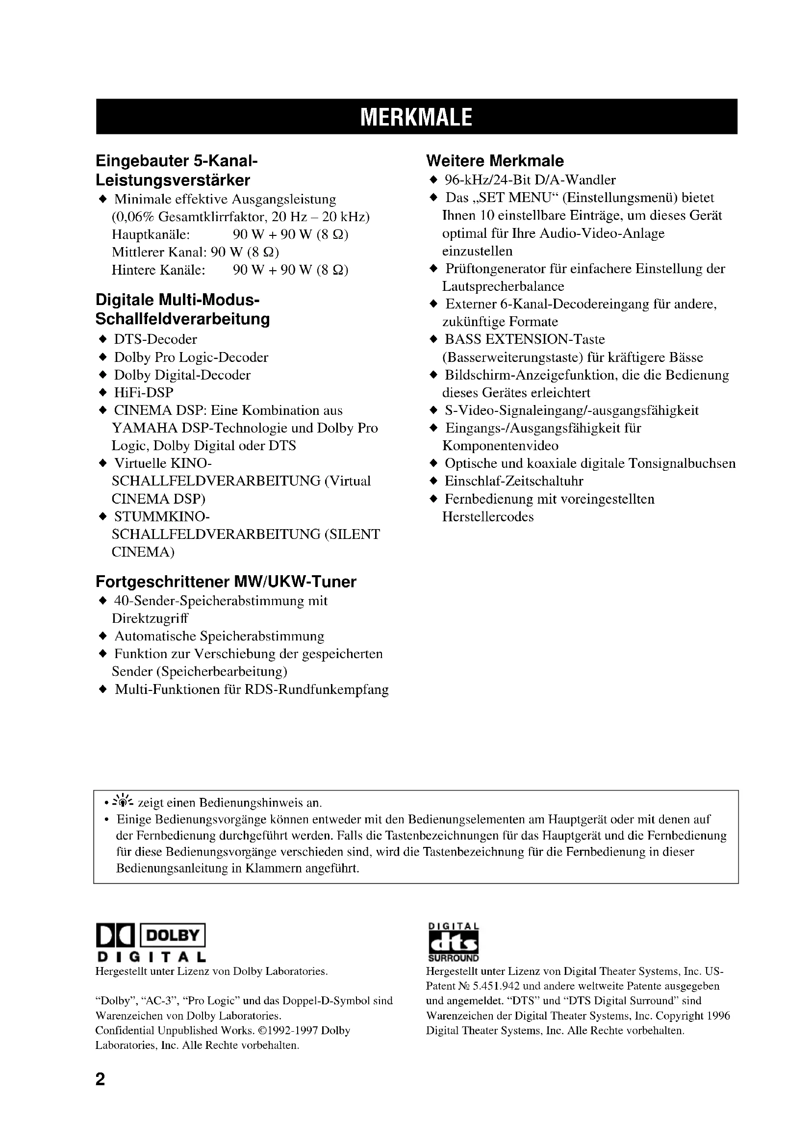 Eingebauter 5-Kanal- Leistungsverstärker ◆ Minimale effektive Ausgangsleistung (0,06% Gesamtklirrfaktor, 20 Hz – 20 kHz) Hauptkanäle: 90 W + 90 W (8 Ω) Mittlerer Kanal: 90 W (8 Ω) Hintere Kanäle: 90 W + 90 W (8 Ω) Digitale Multi-Modus- Schallfeldverarbeitung ◆ DTS-Decoder ◆ Dolby Pro Logic-Decoder ◆ Dolby Digital-Decoder ◆ HiFi-DSP ◆ CINEMA DSP: Eine Kombination aus YAMAHA DSP-Technologie und Dolby Pro Logic, Dolby Digital oder DTS ◆ Virtuelle KINO- SCHALLFELDVERARBEITUNG (Virtual CINEMA DSP) ◆ STUMMKINO- SCHALLFELDVERARBEITUNG (SILENT CINEMA) Fortgeschrittener MW/UKW-Tuner ◆ 40-Sender-Speicherabstimmung mit Direktzugriff ◆ Automatische Speicherabstimmung ◆ Funktion zur Verschiebung der gespeicherten Sender (Speicherbearbeitung) ◆ Multi-Funktionen für RDS-Rundfunkempfang Weitere Merkmale ◆ 96-kHz/24-Bit D/A-Wandler ◆ Das „SET MENU“ (Einstellungsmenü) bietet Ihnen 10 einstellbare Einträge, um dieses Gerät optimal für Ihre Audio-Video-Anlage einzustellen ◆ Prüftongenerator für einfachere Einstellung der Lautsprecherbalance ◆ Externer 6-Kanal-Decodereingang für andere, zukünftige Formate ◆ BASS EXTENSION-Taste (Basserweiterungstaste) für kräftigere Bässe ◆ Bildschirm-Anzeigefunktion, die die Bedienung dieses Gerätes erleichtert ◆ S-Video-Signaleingang/-ausgangsfähigkeit ◆ Eingangs-/Ausgangsfähigkeit für Komponentenvideo ◆ Optische und koaxiale digitale Tonsignalbuchsen ◆ Einschlaf-Zeitschaltuhr ◆ Fernbedienung mit voreingestellten Herstellercodes MERKMALE Hergestellt unter Lizenz von Dolby Laboratories. “Dolby”, “AC-3”, “Pro Logic” und das Doppel-D-Symbol sind Warenzeichen von Dolby Laboratories.Confidential Unpublished Works. ©1992-1997 DolbyLaboratories, Inc. Alle Rechte vorbehalten.Hergestellt unter Lizenz von Digital Theater Systems, Inc. US-Patent Nr. 5.451.942 und andere weltweite Patente ausgegeben und angemeldet. “DTS” und “DTS Digital Surround” sind Warenzeichen der Digital Theater Systems, Inc. Copyright 1996Digital Theater Systems, Inc. Alle Rechte vorbehalten.