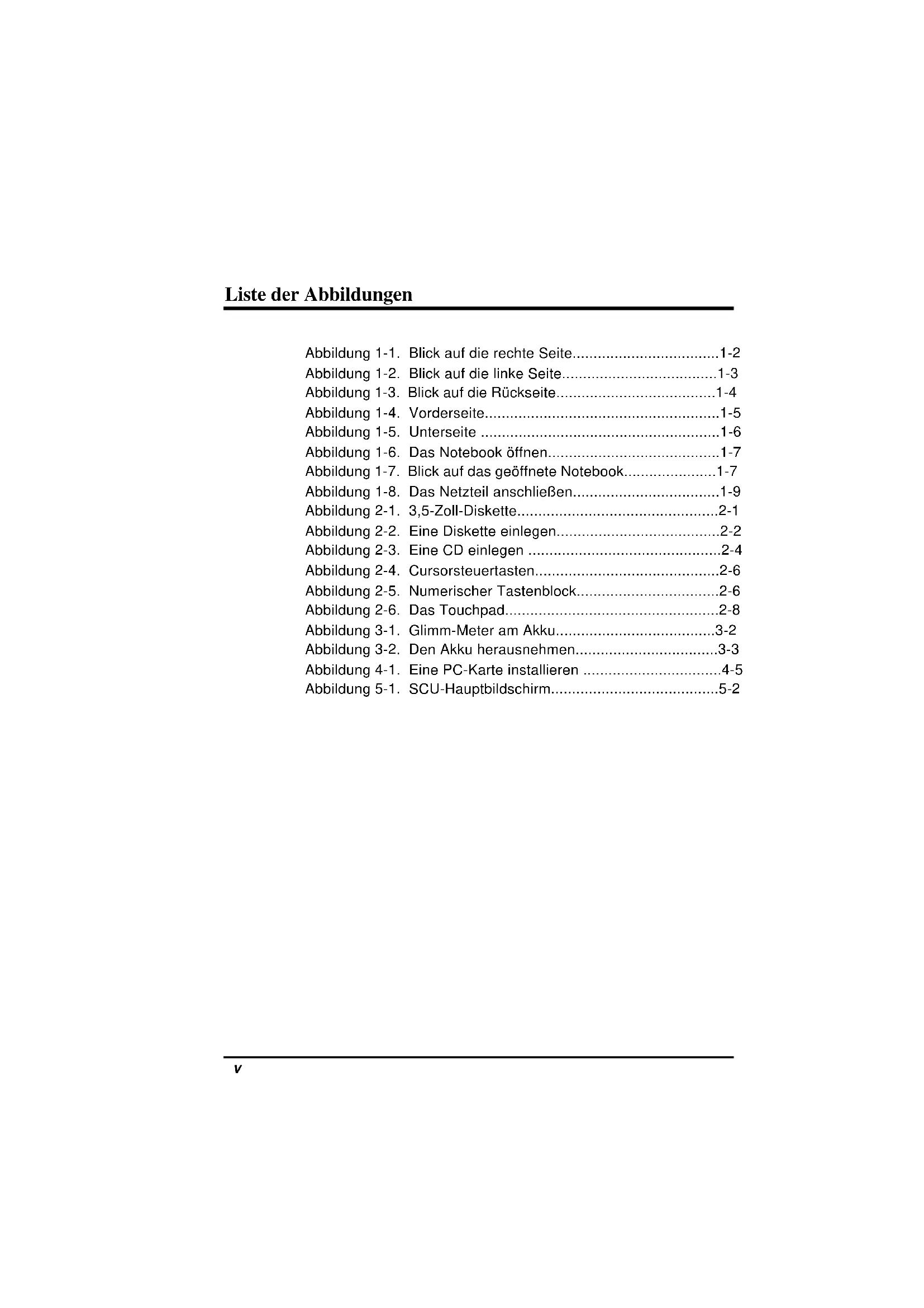 Schreibmaschinentasten, 2-5 Schwacher Akku, 3-5 Signalton aktivieren/deaktivieren, 5-14 Signale und Maßnahmen, 3-5 SCU, 5-1 beenden, 5-15 erweitertes Menü, 5-5 Hauptmenü, 5-3 Menü zur Stromverwaltung, 5-11 Sicherheit, 5-9Index I-3 Serieller Anschluß, 1-4, A-2 Funktion zuweisen, 5-6 Hinweise, 4-2 Sicherheit einstellen, 5-9 So fangen Sie an, 1-1 Softwaretreiber und Utilities, 6-1 Speicher, 4-5 Standby Leerlaufzeit einstellen, 5-12 Stereo-Lautsprecherset, 1-8 Stromverwaltung, 2-10 einstellen, 5-11 Suspend Leerlaufzeit einstellen, 5-13 Suspend-to-Disk, 2-11 Hotkeys, 2-7 Hotkey festlegen, 5-13 manuell aktivieren, 2-10 Suspend-to-Disk-Partition erstellen, 6-3 Suspend-to-RAM Betriebswiederaufnahme bei Modemanruf einstellen, 5-14 Hotkeys, 2-8 Hotkey festlegen, 5-13 manuell aktivieren, 2-10 Zeitpunkt der Betriebswiederaufnahme einstellen, 5-14 Systemaufrüstung, 4-5 Systemerweiterungen, 4-1 Systemstart, 1-10 Bootfolge, 5-5 Fehlerbehebung, B-2