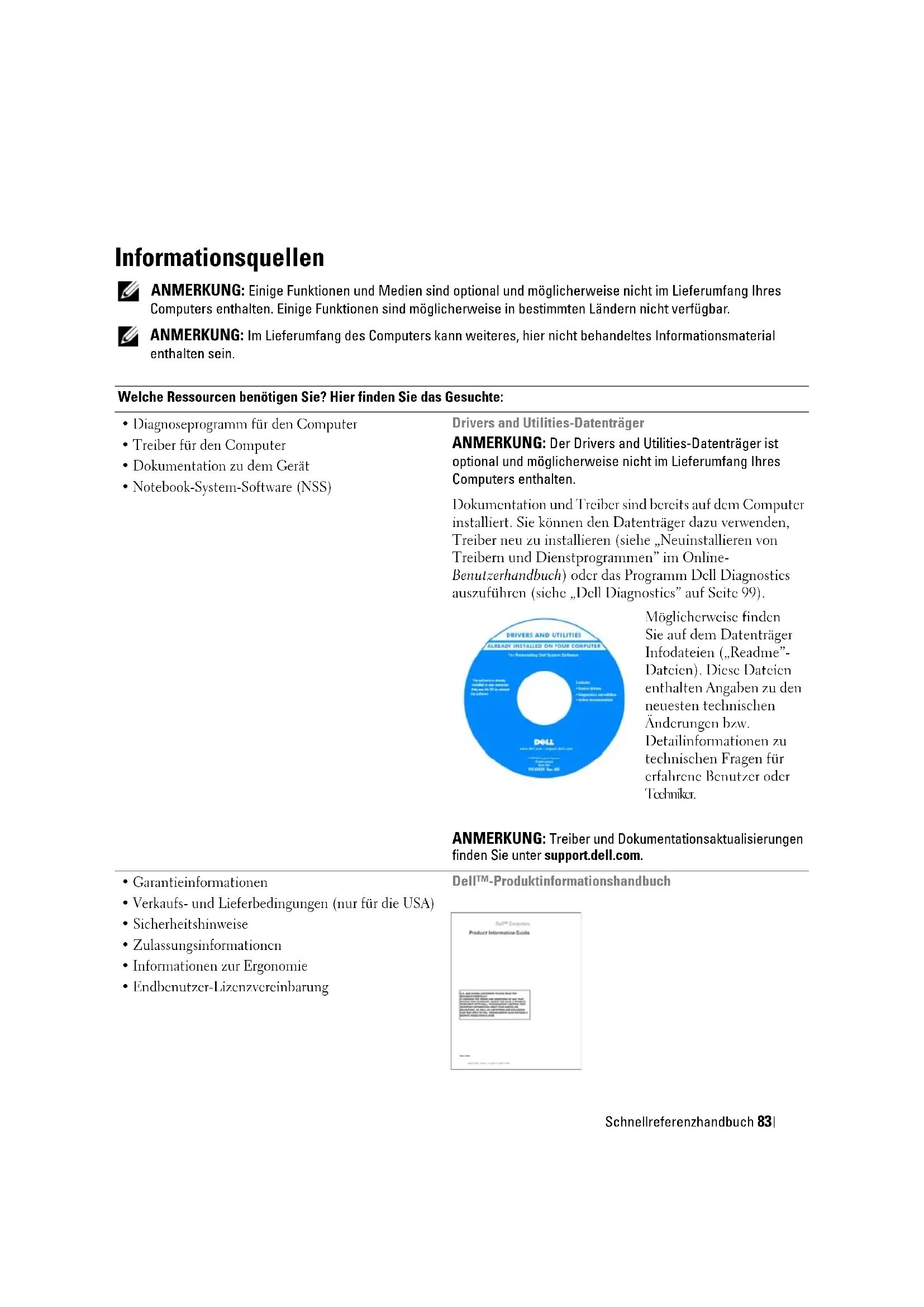 Stichwortverzeichnis . . . . . . . . . . . . . . . . . . . . . . . . . . . . 10382 InhaltSchnellreferenzhandbuch 83 Informationsquellen ANMERKUNG: Einige Funktionen und Medien sind optional und möglicherweise nicht im Lieferumfang Ihres Computers enthalten. Einige Funktionen sind möglicherweise in bestimmten Ländern nicht verfügbar. ANMERKUNG: Im Lieferumfang des Computers kann weiteres, hier nicht behandeltes Informationsmaterial enthalten sein. Welche Ressourcen benötigen Sie? Hier finden Sie das Gesuchte: