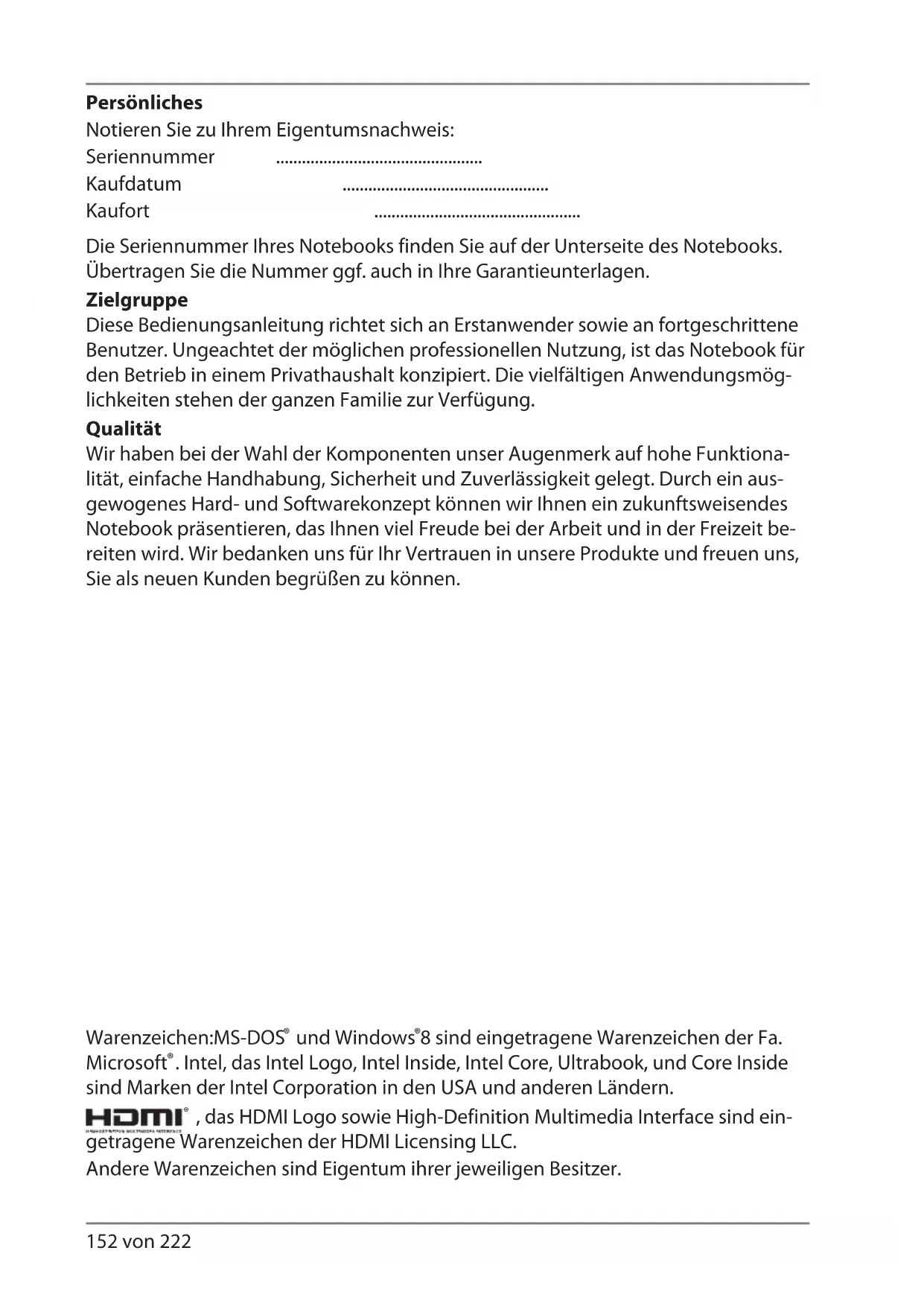 99444 P7632 Aldi BE_LUX_ML MSN 4005 1934 Content final.indb 15199444 P7632 Aldi BE_LUX_ML MSN 4005 1934 Content final.indb 151 24.11.2014 09:26:2024.11.2014 09:26:20152 von 222 Persönliches Notieren Sie zu Ihrem Eigentumsnachweis: Seriennummer ................................................ Kaufdatum ................................................ Kaufort ................................................ Die Seriennummer Ihres Notebooks finden Sie auf der Unterseite des Notebooks. Übertragen Sie die Nummer ggf. auch in Ihre Garantieunterlagen. Zielgruppe Diese Bedienungsanleitung richtet sich an Erstanwender sowie an fortgeschrittene Benutzer. Ungeachtet der möglichen professionellen Nutzung, ist das Notebook für den Betrieb in einem Privathaushalt konzipiert. Die vielfältigen Anwendungsmög- lichkeiten stehen der ganzen Familie zur Verfügung. Qualität Wir haben bei der Wahl der Komponenten unser Augenmerk auf hohe Funktiona- lität, einfache Handhabung, Sicherheit und Zuverlässigkeit gelegt. Durch ein aus- gewogenes Hard- und Softwarekonzept können wir Ihnen ein zukunftsweisendes Notebook präsentieren, das Ihnen viel Freude bei der Arbeit und in der Freizeit be- reiten wird. Wir bedanken uns für Ihr Vertrauen in unsere Produkte und freuen uns, Sie als neuen Kunden begrüßen zu können. Warenzeichen:MS-DOS