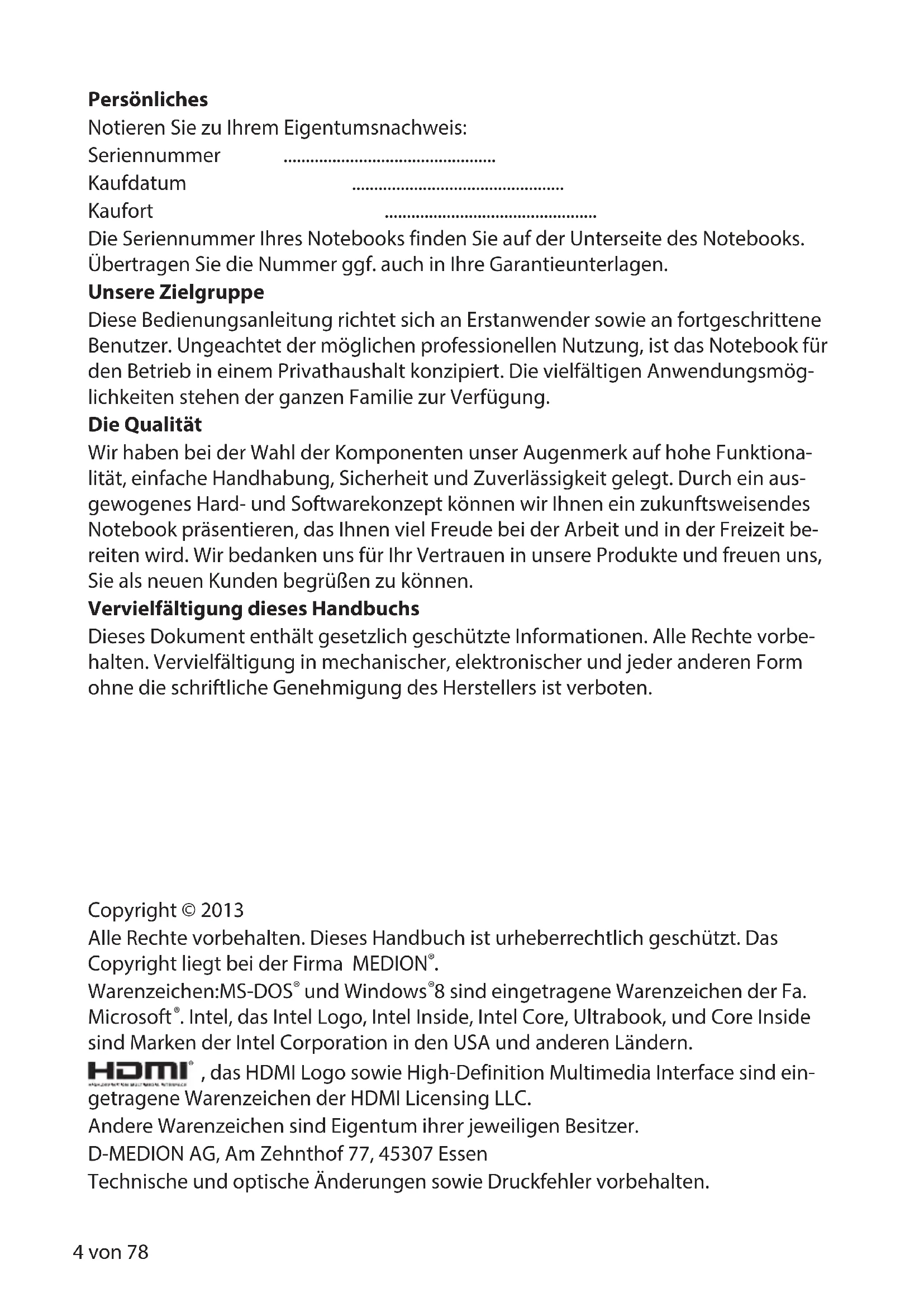 99230 E6234 Aldi BE_DE RC1 Content.indd 399230 E6234 Aldi BE_DE RC1 Content.indd 3 03.06.2013 12:15:4903.06.2013 12:15:494 von 78 Persönliches Notieren Sie zu Ihrem Eigentumsnachweis: Seriennummer ................................................ Kaufdatum ................................................ Kaufort ................................................ Die Seriennummer Ihres Notebooks finden Sie auf der Unterseite des Notebooks. Übertragen Sie die Nummer ggf. auch in Ihre Garantieunterlagen. Unsere Zielgruppe Diese Bedienungsanleitung richtet sich an Erstanwender sowie an fortgeschrittene Benutzer. Ungeachtet der möglichen professionellen Nutzung, ist das Notebook für den Betrieb in einem Privathaushalt konzipiert. Die vielfältigen Anwendungsmög- lichkeiten stehen der ganzen Familie zur Verfügung. Die Qualität Wir haben bei der Wahl der Komponenten unser Augenmerk auf hohe Funktiona- lität, einfache Handhabung, Sicherheit und Zuverlässigkeit gelegt. Durch ein aus- gewogenes Hard- und Softwarekonzept können wir Ihnen ein zukunftsweisendes Notebook präsentieren, das Ihnen viel Freude bei der Arbeit und in der Freizeit be- reiten wird. Wir bedanken uns für Ihr Vertrauen in unsere Produkte und freuen uns, Sie als neuen Kunden begrüßen zu können. Vervielfältigung dieses Handbuchs Dieses Dokument enthält gesetzlich geschützte Informationen. Alle Rechte vorbe- halten. Vervielfältigung in mechanischer, elektronischer und jeder anderen Form ohne die schriftliche Genehmigung des Herstellers ist verboten. Copyright © 2013 Alle Rechte vorbehalten. Dieses Handbuch ist urheberrechtlich geschützt. Das Copyright liegt bei der Firma MEDION