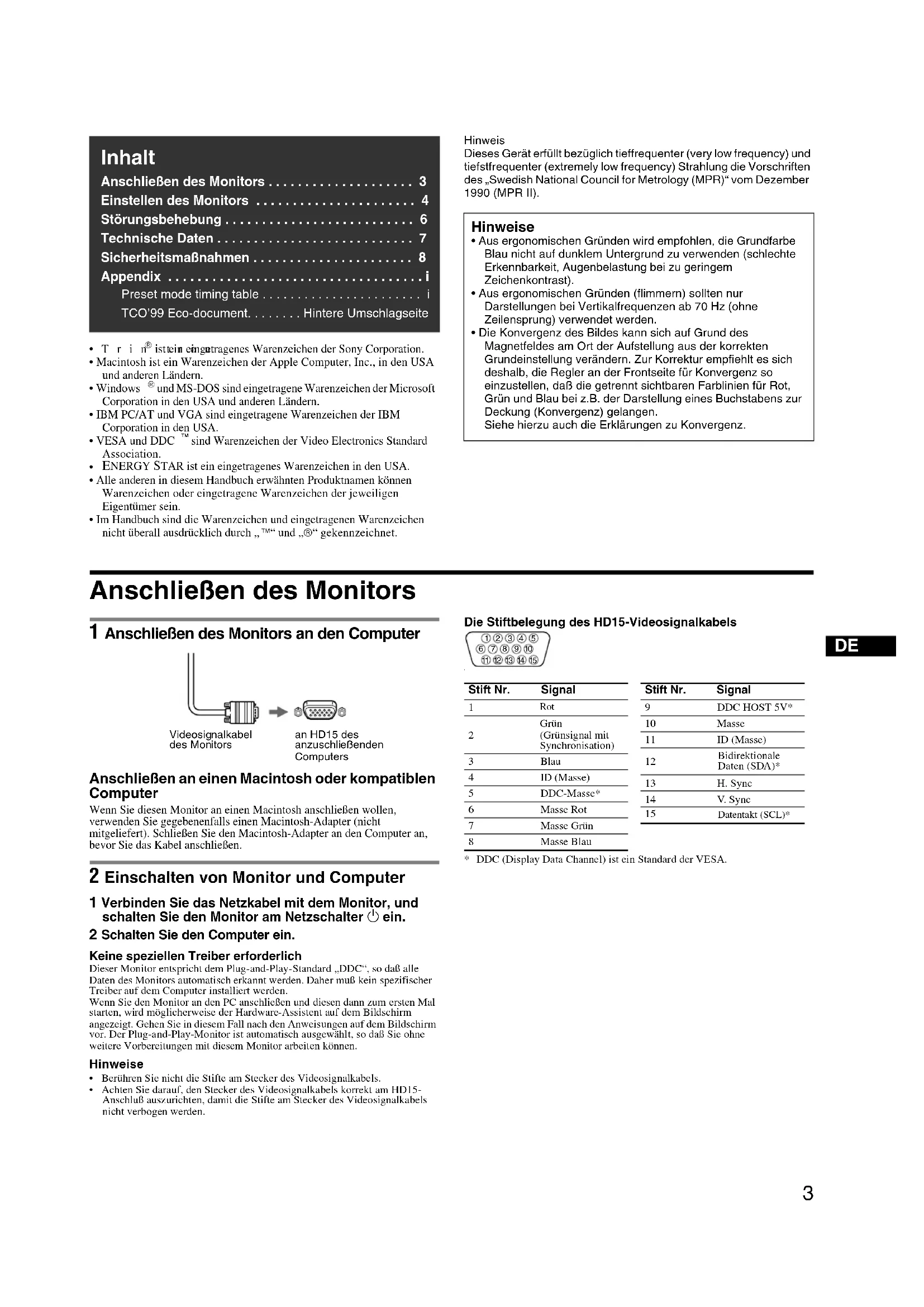 - Trinitron ist ein eingetragenes Warenzeichen der Sony Corporation.• Macintosh ist ein Warenzeichen der Apple Computer, Inc., in den USA und anderen Ländern.• Windows und MS-DOS sind eingetragene Warenzeichen der Microsoft Corporation in den USA und anderen Ländern.• IBM PC/AT und VGA sind eingetragene Warenzeichen der IBM Corporation in den USA.• VESA und DDC sind Warenzeichen der Video Electronics Standard Association. ENERGY STAR ist ein eingetragenes Warenzeichen in den USA.• Alle anderen in diesem Handbuch erwähnten Produktnamen können Warenzeichen oder eingetragene Warenzeichen der jeweiligen Eigentümer sein.• Im Handbuch sind die Warenzeichen und eingetragenen Warenzeichen nicht überall ausdrücklich durch „ä“ und „â“ gekennzeichnet.HinweisDieses Gerät erfüllt bezüglich tieffrequenter (very low frequency) und tiefstfrequenter (extremely low frequency) Strahlung die Vorschriften des „Swedish National Council for Metrology (MPR)“ vom Dezember 1990 (MPR II). Anschließen des Monitors 1 Anschließen des Monitors an den Computer Anschließen an einen Macintosh oder kompatiblen Computer Wenn Sie diesen Monitor an einen Macintosh anschließen wollen, verwenden Sie gegebenenfalls einen Macintosh-Adapter (nicht mitgeliefert). Schließen Sie den Macintosh-Adapter an den Computer an, bevor Sie das Kabel anschließen. 2 Einschalten von Monitor und Computer 1 Verbinden Sie das Netzkabel mit dem Monitor, und schalten Sie den Monitor am Netzschalter 1 ein. 2 Schalten Sie den Computer ein. Keine speziellen Treiber erforderlich Dieser Monitor entspricht dem Plug-and-Play-Standard „DDC“, so daß alle Daten des Monitors automatisch erkannt werden. Daher muß kein spezifischer Treiber auf dem Computer installiert werden. Wenn Sie den Monitor an den PC anschließen und diesen dann zum ersten Mal starten, wird möglicherweise der Hardware-Assistent auf dem Bildschirm angezeigt. Gehen Sie in diesem Fall nach den Anweisungen auf dem Bildschirm vor. Der Plug-and-Play-Monitor ist automatisch ausgewählt, so daß Sie ohne weitere Vorbereitungen mit diesem Monitor arbeiten können. Hinweise