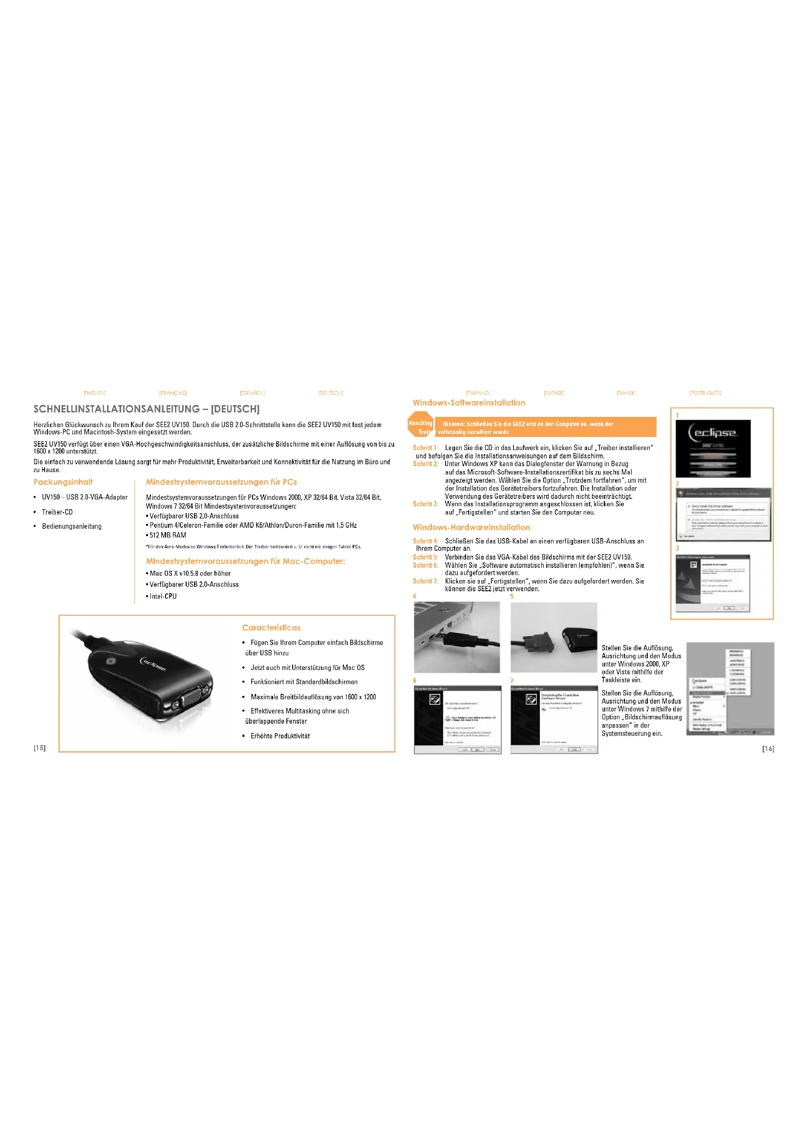 Stellen Sie die Auflösung, Ausrichtung und den Modus unter Windows 2000, XP oder Vista mithilfe der Taskleiste ein. Stellen Sie die Auflösung, Ausrichtung und den Modus unter Windows 7 mithilfe der Option „Bildschirmauflösung anpassen“ in der Systemsteuerung ein. Anschlag[17] [18] [ENGLISH] [fRANçAIS] [ESPAÑOL] [DEUTScH] [ITALIANO] [SVENSK] [DANSK] [PORTUGUÊS] Mac-Softwareinstallation Schritt 1: Legen Sie die CD in das Laufwerk ein und doppelklicken Sie auf das Installationsprogramm für die entsprechende Mac OS-Version, die ausgeführt wird. Schritt 2: Befolgen Sie die Installationsanweisungen auf dem Bildschirm. Schritt 3: Wenn das Installationsprogramm abgeschlossen ist, klicken Sie auf„Neustarten“,umdenComputerneuzustarten. Mac-Hardwareinstallation Schritt 4: SchließenSiedasUSB-KabelaneinenverfügbarenUSB-Anschlussan Ihrem Computer an. Schritt 5: VerbindenSiedasVGA-KabeldesBildschirmsmitderSEE2UV150.Sie können die SEE2 jetzt verwenden.