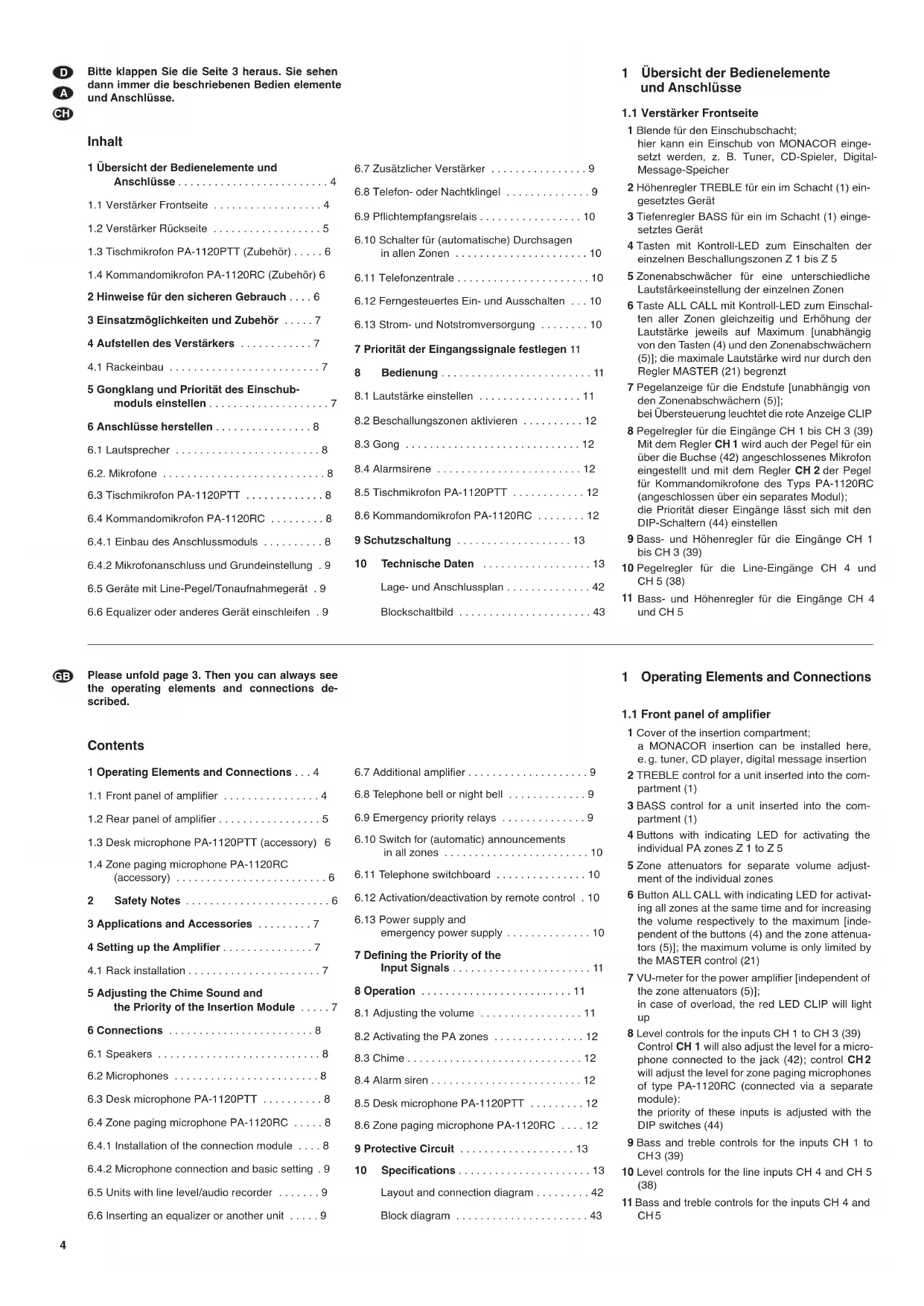 PA-1120 Best.-Nr. 17.0780 PA-1120RC Best.-Nr. 23.2440 PA-1240 Best.-Nr. 17.0790 PA-1120PTT Best.-Nr. 23.2450Bevor Sie einschalten … Wir wünschen Ihnen viel Spaß mit Ihrem neuen Gerät von MONACOR. Bitte lesen Sie diese Bedienungsanlei- tung vor dem Betrieb gründlich durch. Nur so lernen Sie alle Funk tionsmöglichkeiten kennen, ver meiden Fehlbe- dienungen und schützen sich und Ihr Gerät vor eventu- ellen Schäden durch unsachge mäßen Ge brauch. Heben Sie die Anleitung für ein späteres Nachlesen auf. Der deutsche Text beginnt auf der Seite 4. Before switching on … We wish you much pleasure with your new MONACOR unit. Please read these operating instructions carefully prior to operating the unit. Thus, you will get to know all functions of the unit, operating errors will be prevented, and yourself and the unit will be protected against any damage caused by improper use. Please keep the oper - ating instructions for later use. The English text starts on page 4.