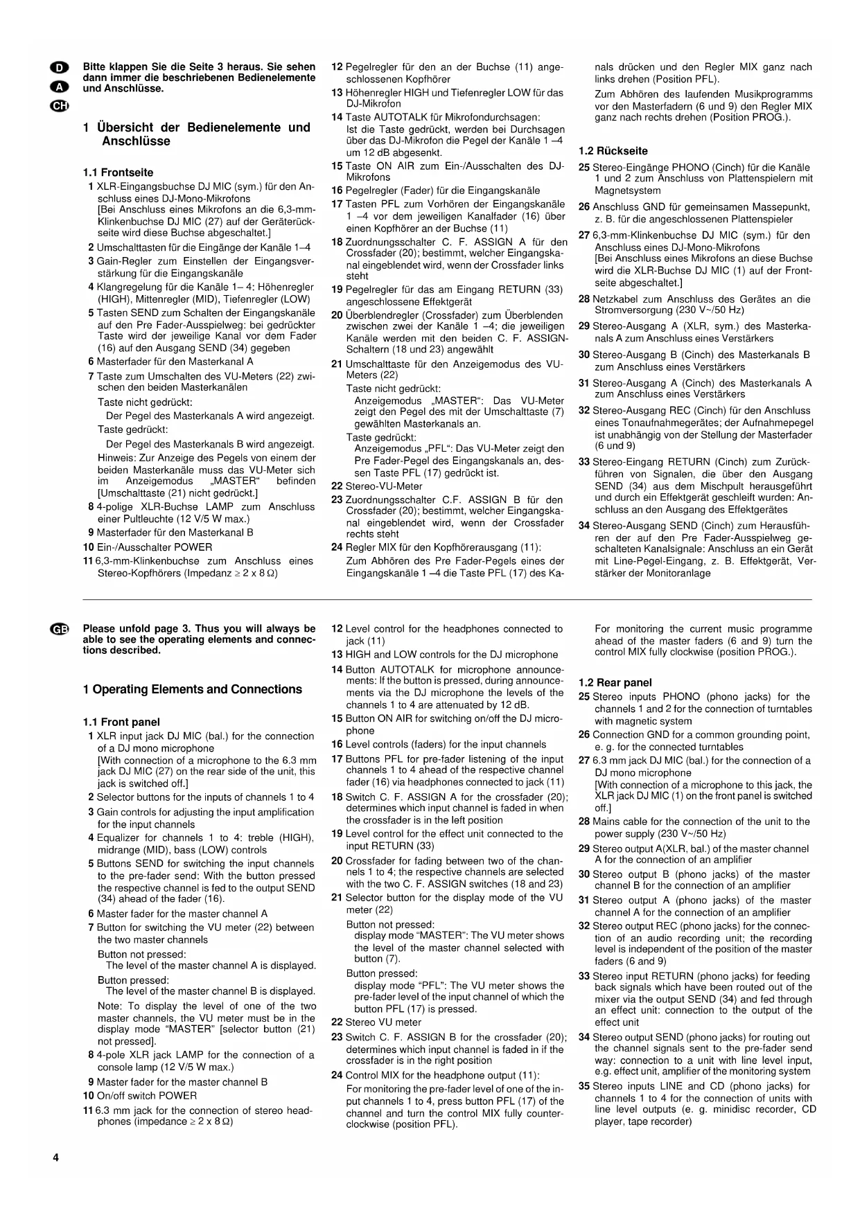 25 Stereo-Eingänge PHONO (Cinch) für die Kanäle 1 und 2 zum Anschluss von Plattenspielern mit Magnetsystem 26 Anschluss GND für gemeinsamen Massepunkt, z. B. für die angeschlossenen Plattenspieler 27 6,3-mm-Klinkenbuchse DJ MIC (sym.) für den Anschluss eines DJ-Mono-Mikrofons [Bei Anschluss eines Mikrofons an diese Buchse wird die XLR-Buchse DJ MIC (1) auf der Front- seite abgeschaltet.] 28 Netzkabel zum Anschluss des Gerätes an die Stromversorgung (230 V~/50 Hz) 29 Stereo-Ausgang A (XLR, sym.) des Masterka- nals A zum Anschluss eines Verstärkers 30 Stereo-Ausgang B (Cinch) des Masterkanals B zum Anschluss eines Verstärkers 31 Stereo-Ausgang A (Cinch) des Masterkanals A zum Anschluss eines Verstärkers 32 Stereo-Ausgang REC (Cinch) für den Anschluss eines Tonaufnahmegerätes; der Aufnahmepegel ist unabhängig von der Stellung der Masterfader (6 und 9) 33 Stereo-Eingang RETURN (Cinch) zum Zurück- führen von Signalen, die über den Ausgang SEND (34) aus dem Mischpult herausgeführt und durch ein Effektgerät geschleift wurden: An- schluss an den Ausgang des Effektgerätes 34 Stereo-Ausgang SEND (Cinch) zum Herausfüh- ren der auf den Pre Fader-Ausspielweg ge- schalteten Kanalsignale: Anschluss an ein Gerät mit Line-Pegel-Eingang, z. B. Effektgerät, Ver- stärker der Monitoranlage Please unfold page 3. Thus you will always be able to see the operating elements and connec- tions described. 1 Operating Elements and Connections
