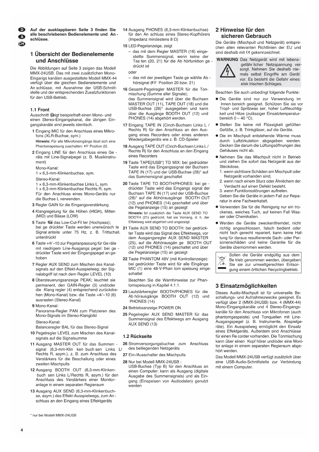 Die Abbildungen auf Seite 3 zeigen das Modell MMX-24USB. Das mit zwei zusätzlichen MonoEingangs kanälen ausgestattete Modell MMX-44 verfügt über die gleichen Bedienelemente und An Schlüsse, mit Ausnahme der USB-Schnittstelle und der entsprechenden Zusatzfunktionen für den USB-Betrieb.