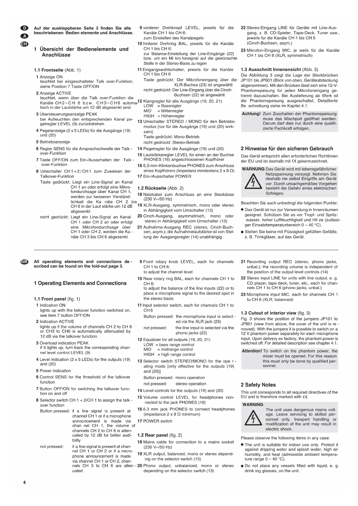 1 Anzeige ON leuchtet bei eingeschalteter Talk over-Funktion, siehe Position 7 Taste OFF/ON 2 Anzeige ACTIVE leuchtet, wenn über die Talk over-Funktion die Kanäle CH2–CH 6 bzw. CH3–CH6 automa- tisch in der Lautstärke um 12 dB abgesenkt sind 3 Übersteuerungsanzeige PEAK bei Aufleuchten den entsprechenden Kanal pe- gelregler LEVEL (9) zurückdrehen 4 Pegelanzeige (2 x 5 LEDs) für die Ausgänge (19) und (20) 5 Betriebsanzeige 6 Regler SENS für die Ansprechschwelle der Talk - over-Funktion 7 Taste OFF/ON zum Ein-/Ausschalten der Talk - over-Funktion 8 Umschalter CH1+2/CH1 zum Zuweisen der Talkover-Funktion Taste gedrückt: Liegt ein Line-Signal an Kanal CH 1 an oder erfolgt eine Mikro- fondurchsage über Kanal CH 1, werden zur besseren Verständ- lichkeit die Ka näle CH 2 bis CH 6 in der Laut stärke um 12 dB abgesenkt nicht gedrückt: Liegt ein Line-Signal an Kanal CH 1 oder CH 2 an oder erfolgt eine Mikrofondurchsage über CH 1 oder CH 2, werden die Ka - näle CH 3 bis CH 6 abgesenkt 9 vorderer Drehknopf LEVEL, jeweils für die Kanäle CH 1 bis CH 6: zum Einstellen des Kanalpegels 10 hinterer Drehring BAL, jeweils für die Kanäle CH 1 bis CH 6: zur Balance-Einstellung der Line-Eingänge (22) bzw. um ein Mi kro fonsignal auf die gewünschte Stelle in der Stereo-Basis zu legen 11 Eingangswahlschalter, jeweils für die Kanäle CH 1 bis CH 6 Taste gedrückt: Der Mikrofoneingang über die XLR-Buchse (23) ist angewählt nicht gedrückt: Der Line-Eingang über die Cinch- Buchsen (22) ist angewählt 12 Klangregler für alle Ausgänge (19, 20, 21) LOW = Bassregler MID = Mittenregler HIGH = Höhenregler 13 Umschalter STEREO / MONO für den Betriebs- modus [nur für die Ausgänge (19) und (20) wirk- sam] Taste gedrückt: Mono-Betrieb nicht gedrückt: Stereo-Betrieb 14 Pegelregler für die Ausgänge (19) und (20) 15 Lautstärkeregler LEVEL für einen an der Buchse PHONES (16) angeschlossenen Kopfhörer 16 6,3-mm-Klinkenbuchse PHONES zum Anschluss eines Kopfhörers (Impedanz mindestens 2 x 8 Ω) 17 Ein-/Ausschalter POWER