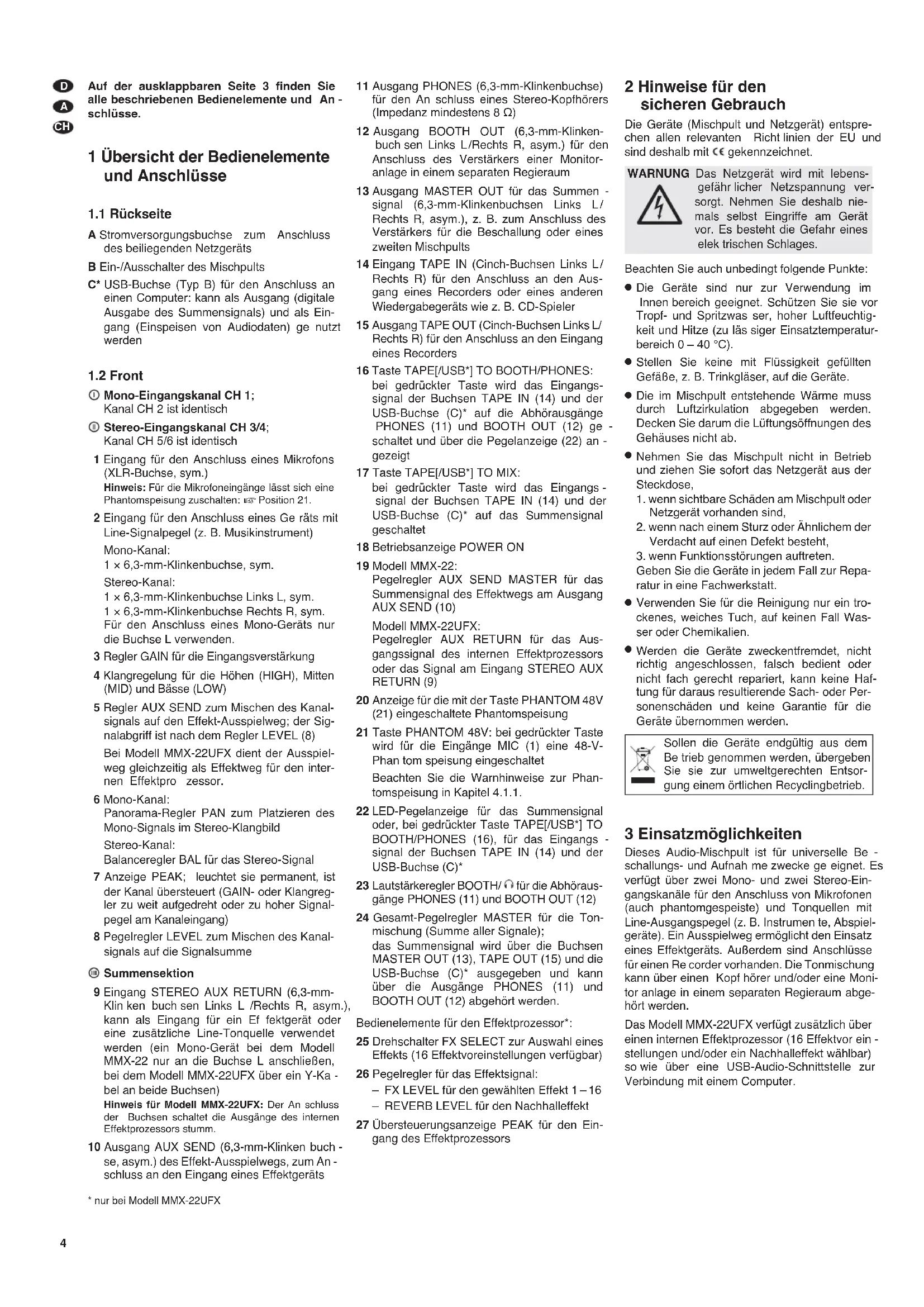 Das Modell MMX-22UFX verfügt zusätzlich über einen internen Effektprozessor (16 Effektvor einstellungen und/oder ein Nachhalleffekt wählbar) so wie über eine USB-Audio-Schnittstelle zur Verbindung mit einem Computer.