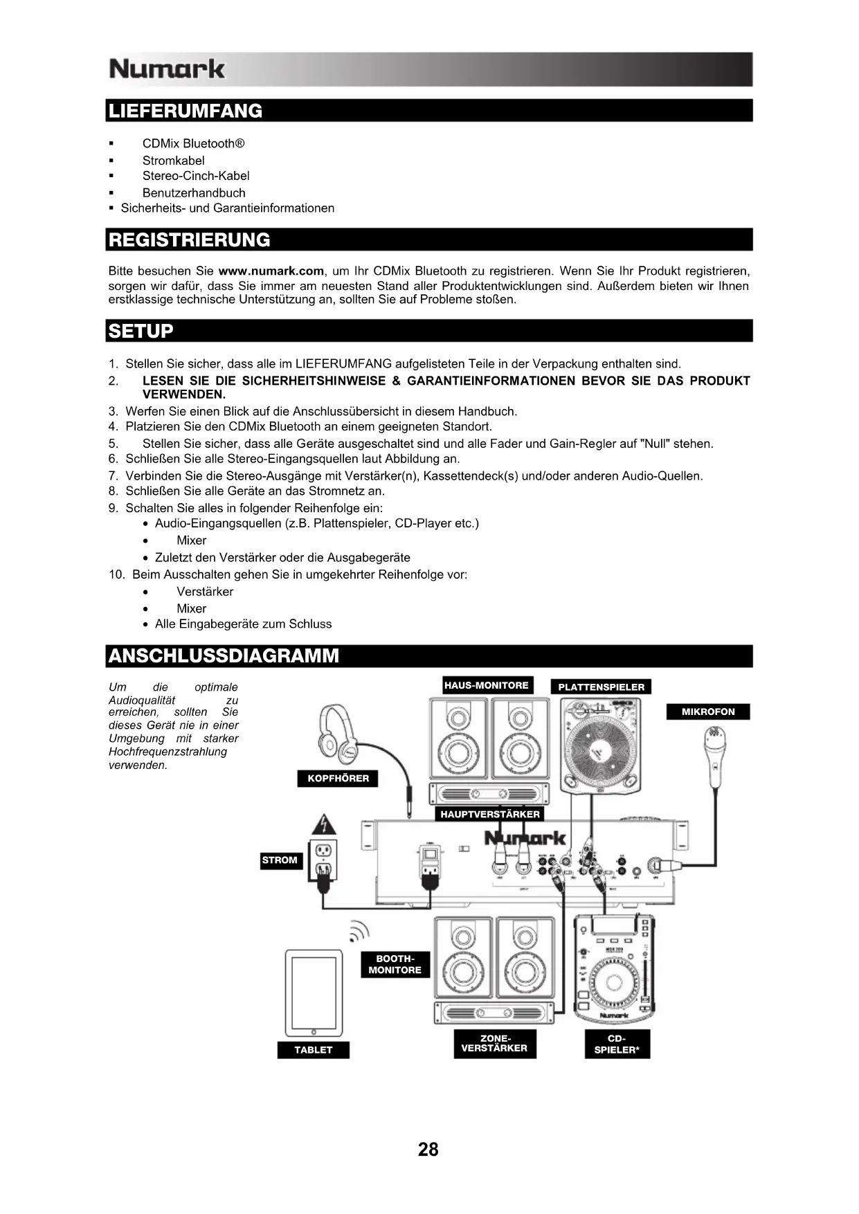 sarà il cambiamento del pitch. Rilasciando la rotella si tornerà al pitch originale in cui i BPM saranno nuovamente uguali.28 LIEFERUMFANG CDMix Bluetooth® Stromkabel Stereo-Cinch-Kabel Benutzerhandbuch Sicherheits- und Garantieinformationen REGISTRIERUNG Bitte besuchen Sie www.numark.com, um Ihr CDMix Bluetooth zu registrieren. Wenn Sie Ihr Produkt registrieren, sorgen wir dafür, dass Sie immer am neuesten Stand aller Produktentwicklungen sind. Außerdem bieten wir Ihnen erstklassige technische Unterstützung an, sollten Sie auf Probleme stoßen. SETUP