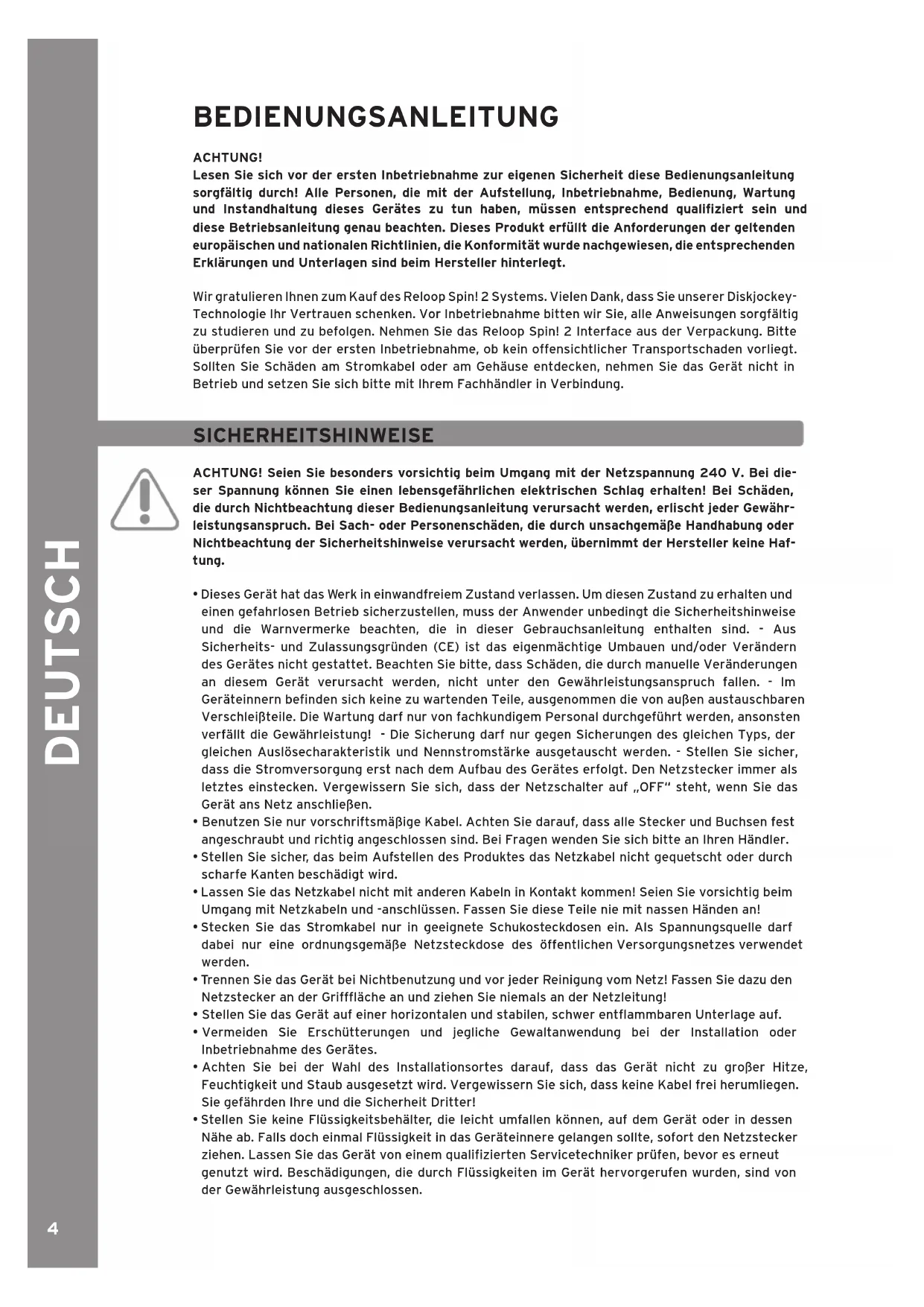 Wir gratulieren Ihnen zum Kauf des Reloop Spin! 2 Systems. Vielen Dank, dass Sie unserer Diskjockey-Technologie Ihr Vertrauen schenken. Vor Inbetriebnahme bitten wir Sie, alle Anweisungen sorgfältig zu studieren und zu befolgen. Nehmen Sie das Reloop Spin! 2 Interface aus der Verpackung. Bitte überprüfen Sie vor der ersten Inbetriebnahme, ob kein offensichtlicher Transportschaden vorliegt. Sollten Sie Schäden am Stromkabel oder am Gehäuse entdecken, nehmen Sie das Gerät nicht in Betrieb und setzen Sie sich bitte mit Ihrem Fachhändler in Verbindung.