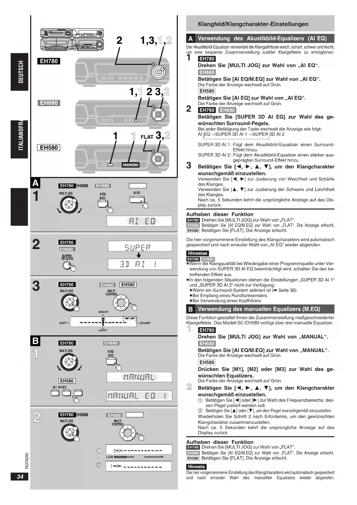 Verwendung des manuellen Equalizers (M.EQ) Diese Funktion gestattet Ihnen die Zusammenstellung maßgeschneiderter Klangeffekte. Das Modell SC-EH580 verfügt über drei manuelle Equalizer. [EH780] Drehen Sie [MULTI JOG] zur Wahl von „MANUAL“. [EH680] Betätigen Sie [AI EQ/M.EQ] zur Wahl von „MANUAL“. Die Farbe der Anzeige wechselt auf Grün. [EH580] Drücken Sie [M1], [M2] oder [M3] zur Wahl des ge-wünschten Equalizers. Die Farbe der Anzeige wechselt auf Grün. Betätigen Sie [2, 1, 3, 4], um den Klangcharakter wunschgemäß einzustellen. Betätigen Sie [2] oder [1] zur Wahl des Frequenzbereichs, des- sen Pegel justiert werden soll. Betätigen Sie [3] oder [4], um den Pegel wunschgemäß einzustellen. Wiederholen Sie Schritt 2 nach Erfordernis, um den gewünschten Klangcharakter zusammenzustellen. Nach ca. 5 Sekunden kehrt die ursprüngliche Anzeige auf das Display zurück. Aufheben dieser Funktion [EH780] Drehen Sie [MULTI JOG] zur Wahl von „FLAT“. [EH680] Betätigen Sie [AI EQ/M.EQ] zur Wahl von „FLAT“. Die Anzeige erlischt. [EH580] Betätigen Sie [FLAT]. Die Anzeige erlischt. Hinweis Die hier vorgenommene Einstellung des Klangcharakters wird automatisch gespeichert und nach erneuter Wahl des manuellen Equalizers wieder abgerufen.35 RQT6299 DEUTSCHITALIANO FRANÇAIS Cambiamento del campo e qualità del suono