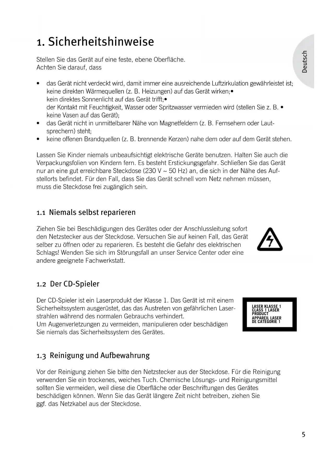 Der CD-Spieler ist ein Laserprodukt der Klasse 1. Das Gerät ist mit einem Sicherheitssystem ausgerüstet, das das Austreten von gefährlichen Laser- strahlen während des normalen Gebrauchs verhindert. Um Augenverletzungen zu vermeiden, manipulieren oder beschädigen Sie niemals das Sicherheitssystem des Gerätes.