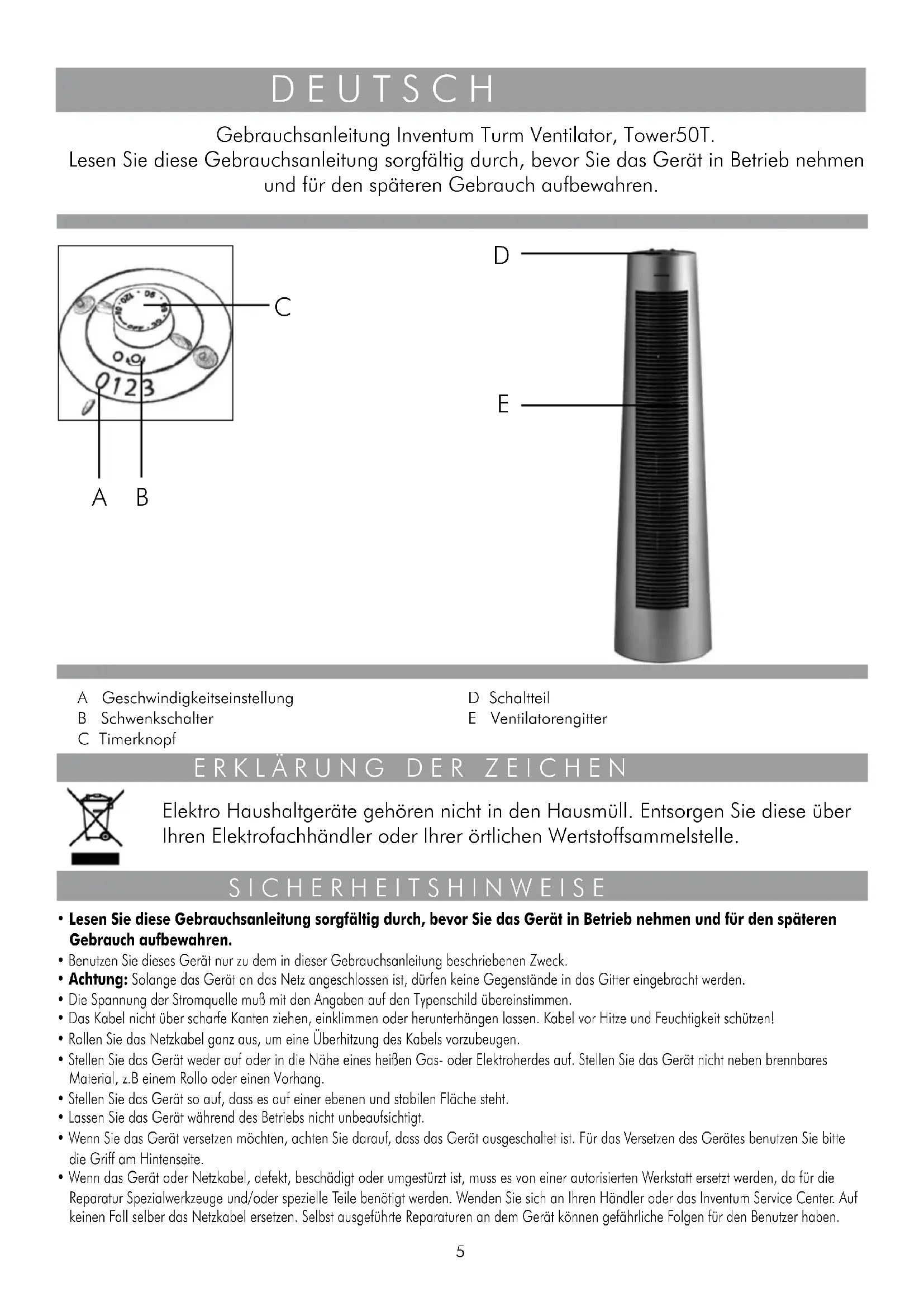 Gebrauchsanleitung Inventum Turm Ventilator, Tower50T.