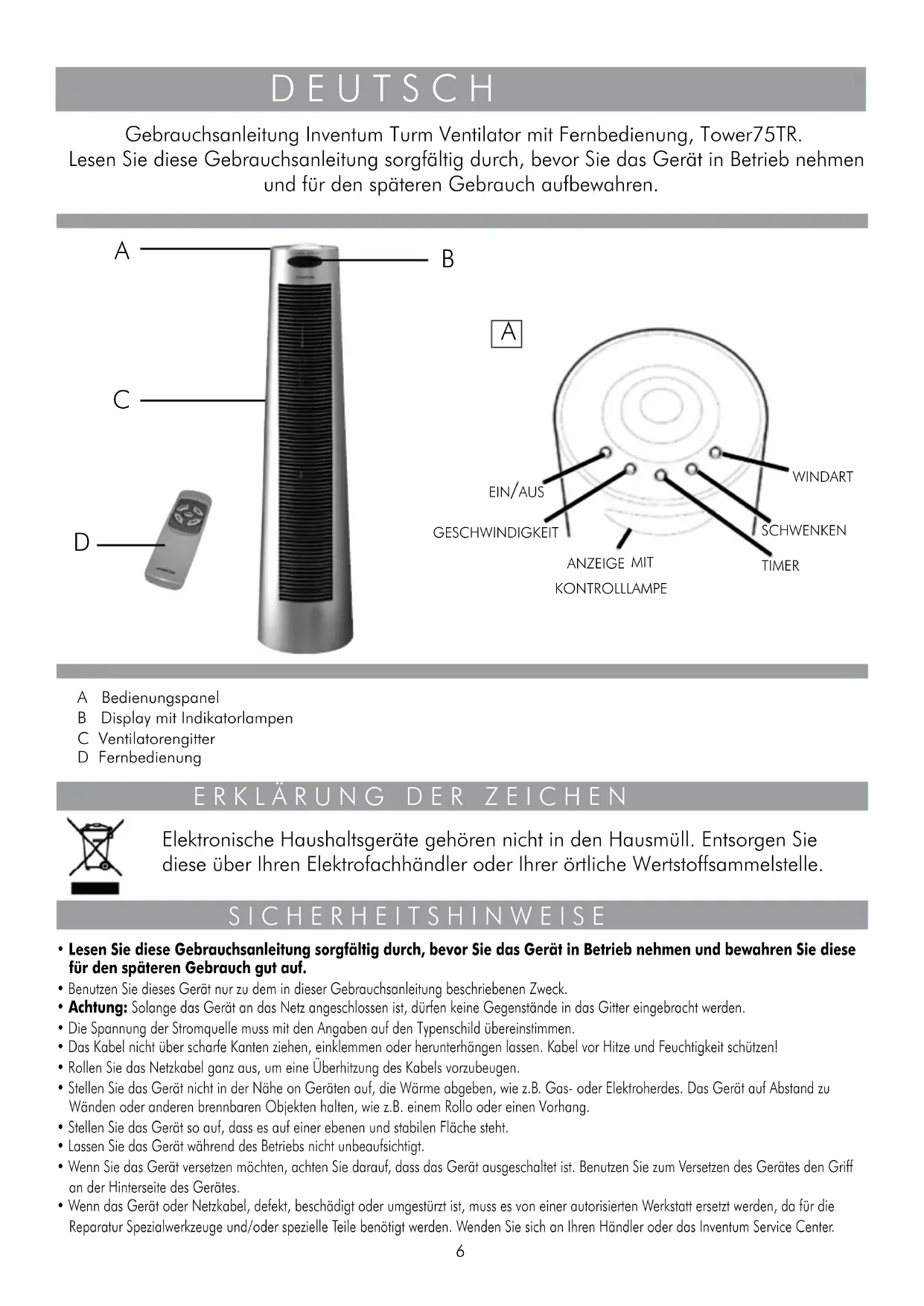 - Wenn das Gerät oder Netzkabel, defekt, beschädigt oder umgestürzt ist, muss es von einer autorisierten Werkstatt ersetzt werden, da für die Reparatur Spezialwerkzeuge und/oder spezielle Teile benötigt werden. Wenden Sie sich an Ihren Händler oder das Inventum Service Center. D E U T S C H Gebrauchsanleitung Inventum Turm Ventilator mit Fernbedienung, Tower75TR. Lesen Sie diese Gebrauchsanleitung sorgfältig durch, bevor Sie das Gerät in Betrieb nehmen und für den späteren Gebrauch aufbewahren. S I C H E R H E I T S H I N W E I S E A Bedienungspanel B Display mit Indikatorlampen C Ventilatorengitter D Fernbedienung E R K L Ä R U N G D E R Z E I C H E N Elektronische Haushaltsgeräte gehören nicht in den Hausmüll. Entsorgen Sie diese über Ihren Elektrofachhändler oder Ihrer örtliche Wertstoffsammelstelle.