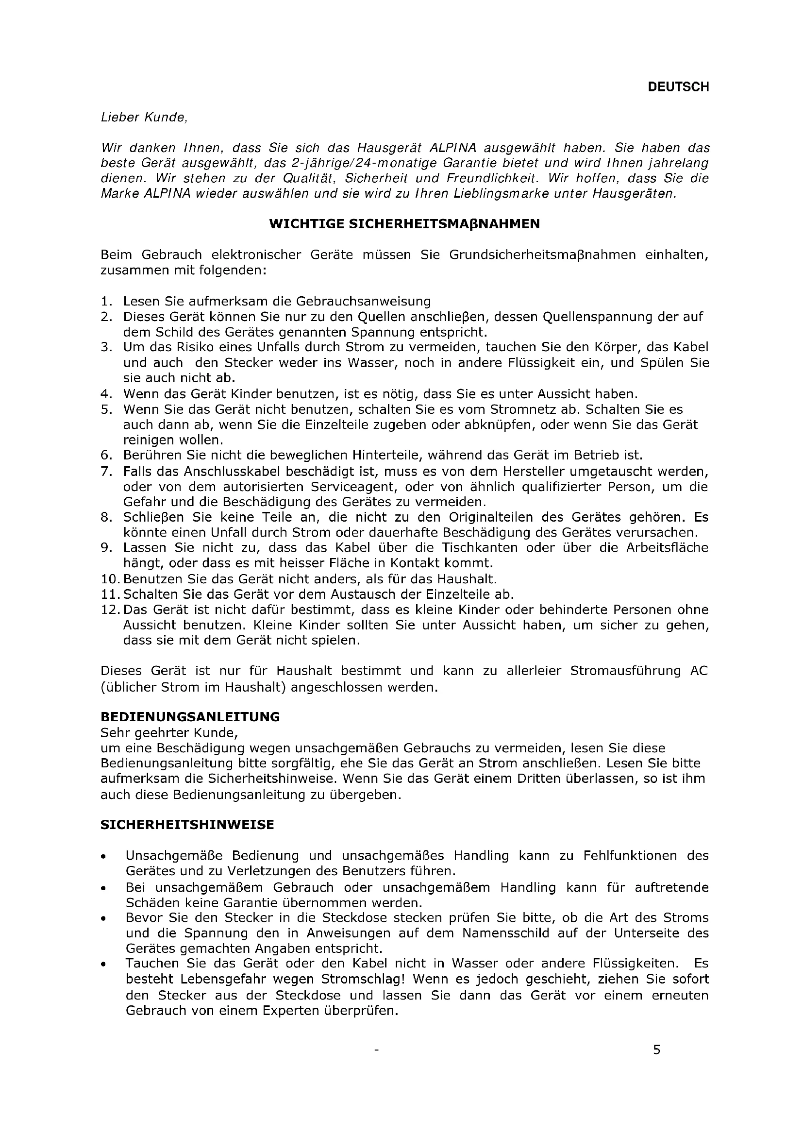 Lieber Kunde, Wir danken Ihnen, dass Sie sich das Hausgerät ALPINA ausgewählt haben. Sie haben das beste Gerät ausgewählt, das 2-jährige/24-monatige Garantie bietet und wird Ihnen jahrelang dienen. Wir stehen zu der Qualität, Sicherheit und Freundlichkeit. Wir hoffen, dass Sie die Marke ALPINA wieder auswählen und sie wird zu Ihren Lieblingsmarke unter Hausgeräten. WICHTIGE SICHERHEITSMAβNAHMEN Beim Gebrauch elektronischer Geräte müssen Sie Grundsicherheitsmaβnahmen einhalten, zusammen mit folgenden: