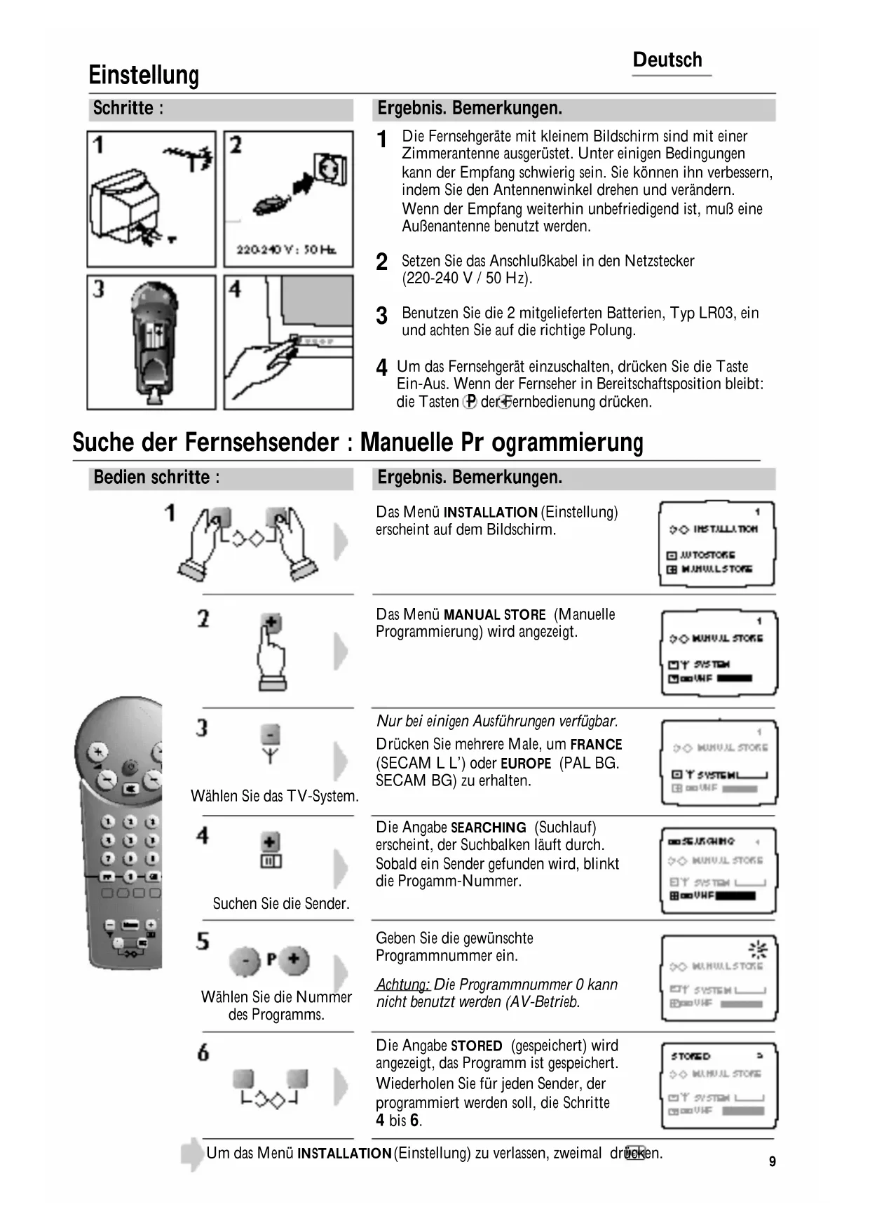 1 Die Fernsehgeräte mit keinem Bildschirm sind mit einer Zimmerantenne ausgerüstet. Unter einigen Bedingungen kann der Empfang schwierig sein. Sie konnen ihn verbessern, indem Sie den Antennenwinkel drehen und verändern. Wenn der Empfang weiterhin unbefriedigend ist, muß eine Außenantenne benutzt werden.