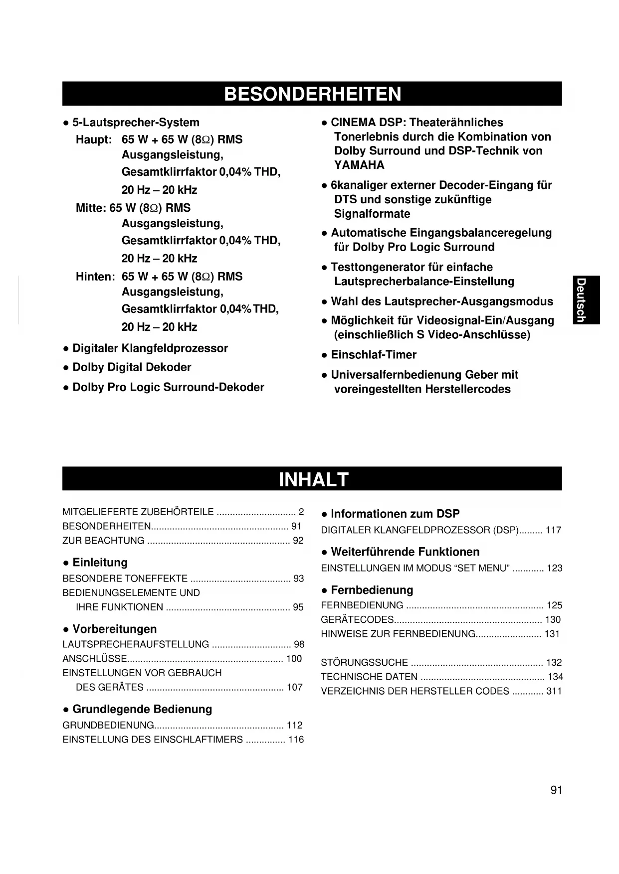 BESONDERHEITEN INHALT ● CINEMA DSP: Theaterähnliches Tonerlebnis durch die Kombination von Dolby Surround und DSP-Technik von YAMAHA ● 6kanaliger externer Decoder-Eingang für DTS und sonstige zukünftige Signalformate ● Automatische Eingangsbalanceregelung für Dolby Pro Logic Surround ● Testtongenerator für einfache Lautsprecherbalance-Einstellung ● Wahl des Lautsprecher-Ausgangsmodus ● Möglichkeit für Videosignal-Ein/Ausgang (einschließlich S Video-Anschlüsse) ● Einschlaf-Timer ● Universalfernbedienung Geber mit voreingestellten Herstellercodes DSP-A595-g1 3/25/99, 3:57 PM9192 ZUR BEACHTUNG: BITTE LESEN SIE DIESE BEDIENUNGS- ANLEITUNG VOR INBETRIEBNAHME DES GERÄTES.