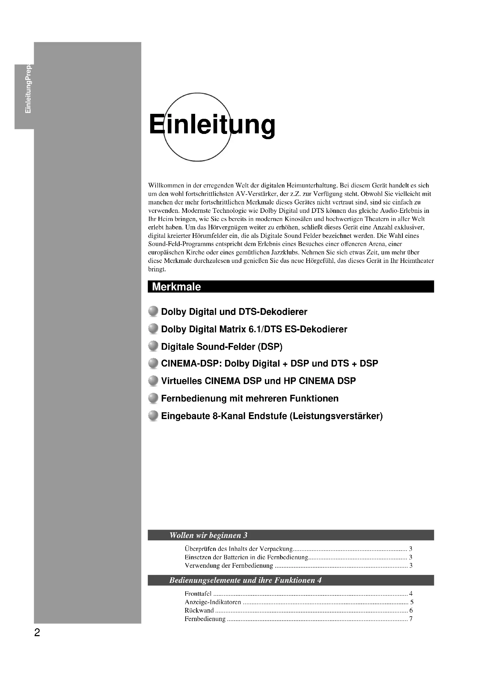 - Willkommen in der erregenden Welt der digitalen Heimunterhaltung. Bei diesem Gerät handelt es sich um den wohl fortschrittlichsten AV-Verstärker, der z.Z. zur Verfügung steht. Obwohl Sie vielleicht mit manchen der mehr fortschrittlichen Merkmale dieses Gerätes nicht vertraut sind, sind sie einfach zu verwenden. Modernste Technologie wie Dolby Digital und DTS können das gleiche Audio-Erlebnis in Ihr Heim bringen, wie Sie es bereits in modernen Kinosälen und hochwertigen Theatern in aller Welt erlebt haben. Um das Hörvergnügen weiter zu erhöhen, schließt dieses Gerät eine Anzahl exklusiver, digital kreierter Hörumfelder ein, die als Digitale Sound Felder bezeichnet werden. Die Wahl eines Sound-Feld-Programms entspricht dem Erlebnis eines Besuches einer offeneren Arena, einer europäischen Kirche oder eines gemütlichen Jazzklubs. Nehmen Sie sich etwas Zeit, um mehr über diese Merkmale durchzulesen und genießen Sie das neue Hörgefühl, das dieses Gerät in Ihr Heimtheater bringt. Einleitung Merkmale Dolby Digital und DTS-Dekodierer Dolby Digital Matrix 6.1/DTS ES-Dekodierer Digitale Sound-Felder (DSP) CINEMA-DSP: Dolby Digital + DSP und DTS + DSP Virtuelles CINEMA DSP und HP CINEMA DSP Fernbedienung mit mehreren Funktionen Eingebaute 8-Kanal Endstufe (Leistungsverstärker) Wollen wir beginnen 3 Überprüfen des Inhalts der Verpackung p. 3