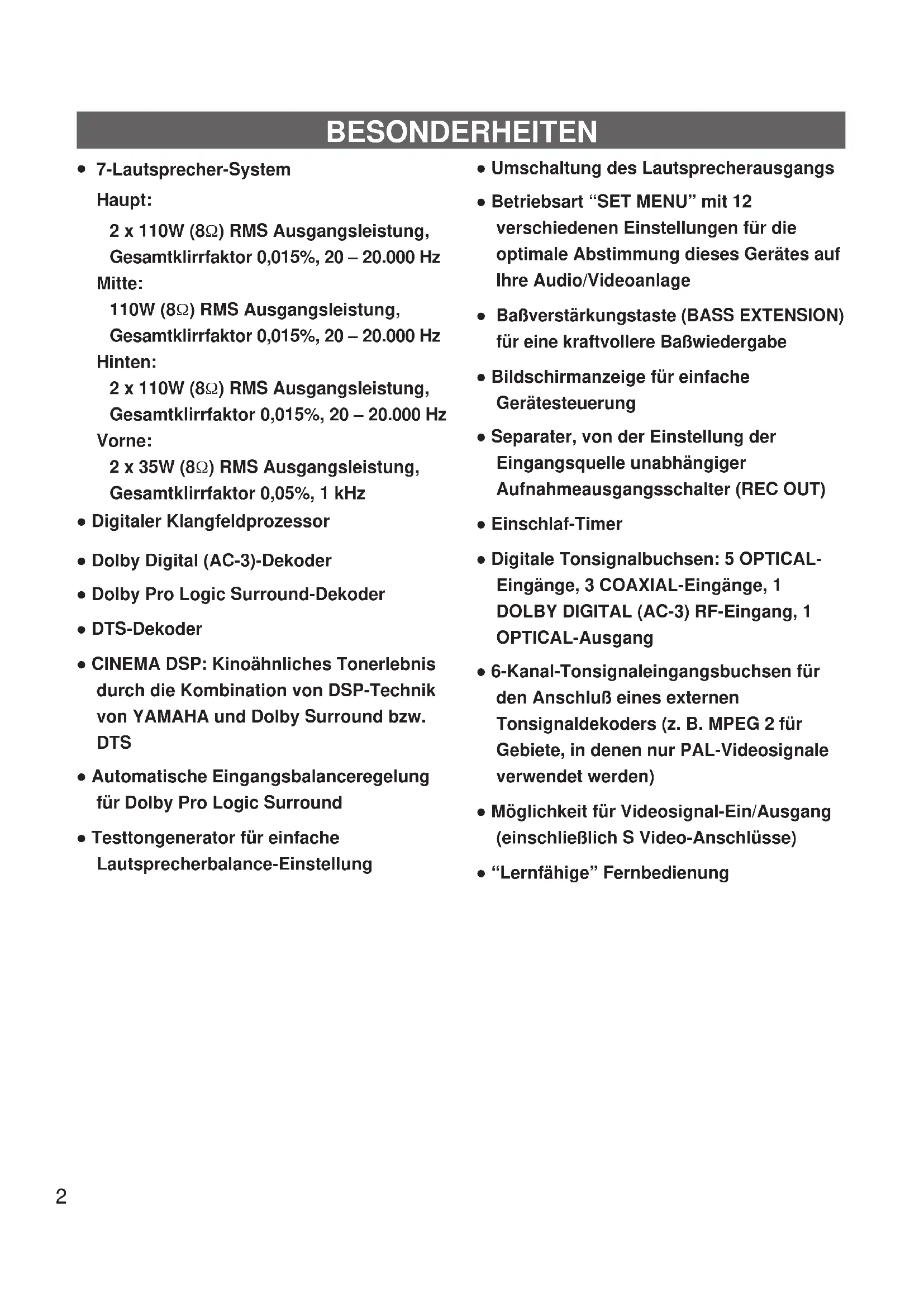 7-Lautsprecher-System Haupt: 2 x 110W (8Ω) RMS Ausgangsleistung, Gesamtklirrfaktor 0,015%, 20 – 20.000 Hz Mitte: 110W (8Ω) RMS Ausgangsleistung, Gesamtklirrfaktor 0,015%, 20 – 20.000 Hz Hinten: 2 x 110W (8Ω) RMS Ausgangsleistung, Gesamtklirrfaktor 0,015%, 20 – 20.000 Hz Vorne: 2 x 35W (8Ω) RMS Ausgangsleistung, Gesamtklirrfaktor 0,05%, 1 kHz ● Digitaler Klangfeldprozessor ● Dolby Digital (AC-3)-Dekoder ● Dolby Pro Logic Surround-Dekoder ● DTS-Dekoder ● CINEMA DSP: Kinoähnliches Tonerlebnis durch die Kombination von DSP-Technik von YAMAHA und Dolby Surround bzw. DTS ● Automatische Eingangsbalanceregelung für Dolby Pro Logic Surround ● Testtongenerator für einfache Lautsprecherbalance-Einstellung ● Umschaltung des Lautsprecherausgangs ● Betriebsart “SET MENU” mit 12 verschiedenen Einstellungen für die optimale Abstimmung dieses Gerätes auf Ihre Audio/Videoanlage