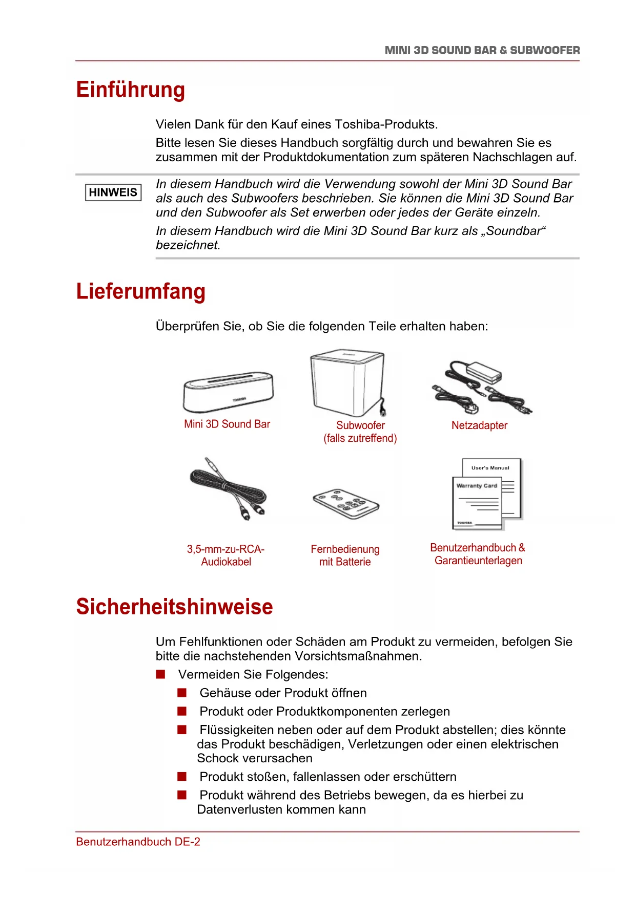Einführung Vielen Dank für den Kauf eines Toshiba-Produkts. Bitte lesen Sie dieses Handbuch sorgfältig durch und bewahren Sie es zusammen mit der Produktdokumentation zum späteren Nachschlagen auf. Lieferumfang Überprüfen Sie, ob Sie die folgenden Teile erhalten haben: Sicherheitshinweise Um Fehlfunktionen oder Schäden am Produkt zu vermeiden, befolgen Sie bitte die nachstehenden Vorsichtsmaßnahmen. ■ Vermeiden Sie Folgendes: ■ Gehäuse oder Produkt öffnen ■ Produkt oder Produktkomponenten zerlegen ■ Flüssigkeiten neben oder auf dem Produkt abstellen; dies könnte das Produkt beschädigen, Verletzungen oder einen elektrischen Schock verursachen ■ Produkt stoßen, fallenlassen oder erschüttern ■ Produkt während des Betriebs bewegen, da es hierbei zu Datenverlusten kommen kann In diesem Handbuch wird die Verwendung sowohl der Mini 3D Sound Bar als auch des Subwoofers beschrieben. Sie können die Mini 3D Sound Bar und den Subwoofer als Set erwerben oder jedes der Geräte einzeln. In diesem Handbuch wird die Mini 3D Sound Bar kurz als „Soundbar“ bezeichnet. HINWEIS User’s Manual Mini 3D Sound Bar Subwoofer (falls zutreffend) Netzadapter 3,5-mm-zu-RCA- Audiokabel Fernbedienung mit Batterie Benutzerhandbuch & GarantieunterlagenDE-3 Benutzerhandbuch