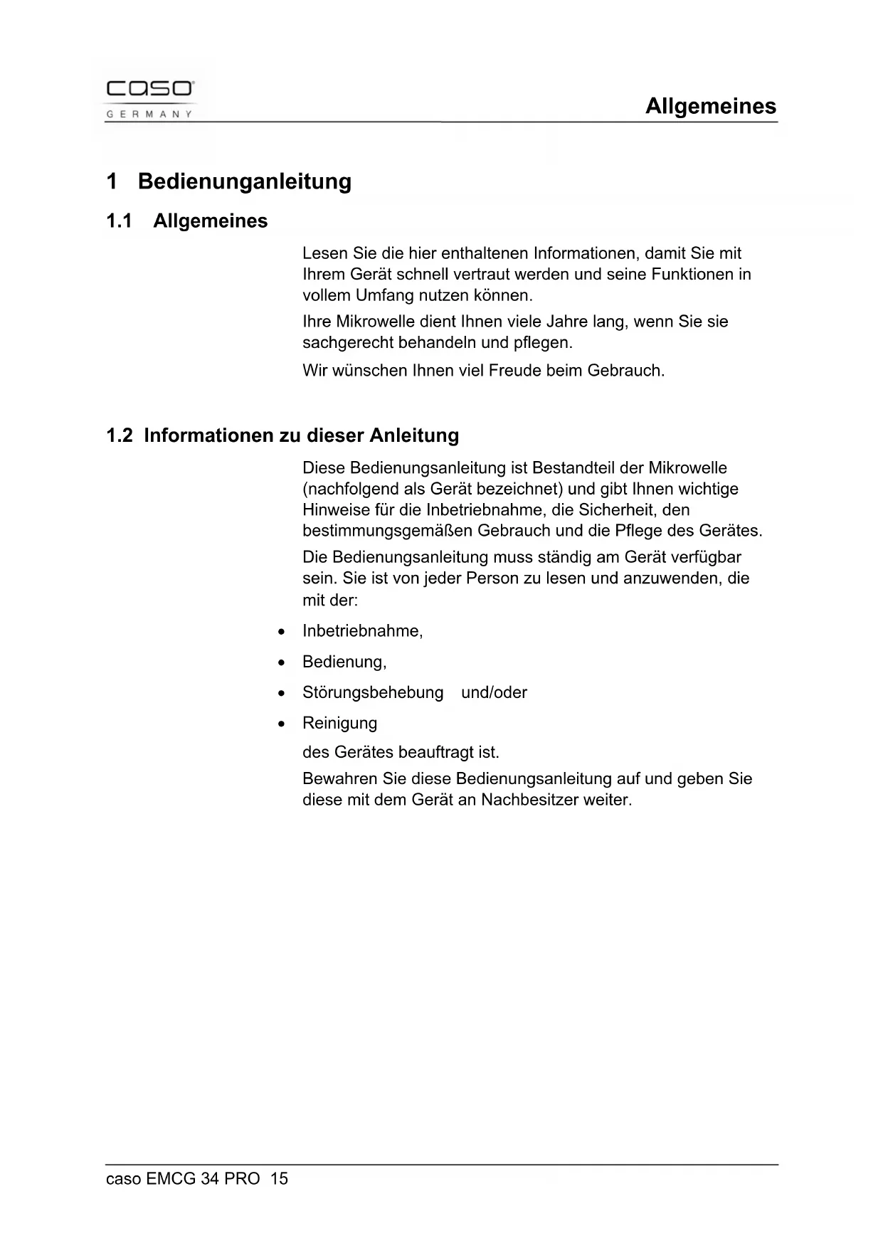 - Reinigung des Gerätes beauftragt ist. Bewahren Sie diese Bedienungsanleitung auf und geben Sie diese mit dem Gerät an Nachbesitzer weiter.Allgemeines caso EMCG 34 PRO 16