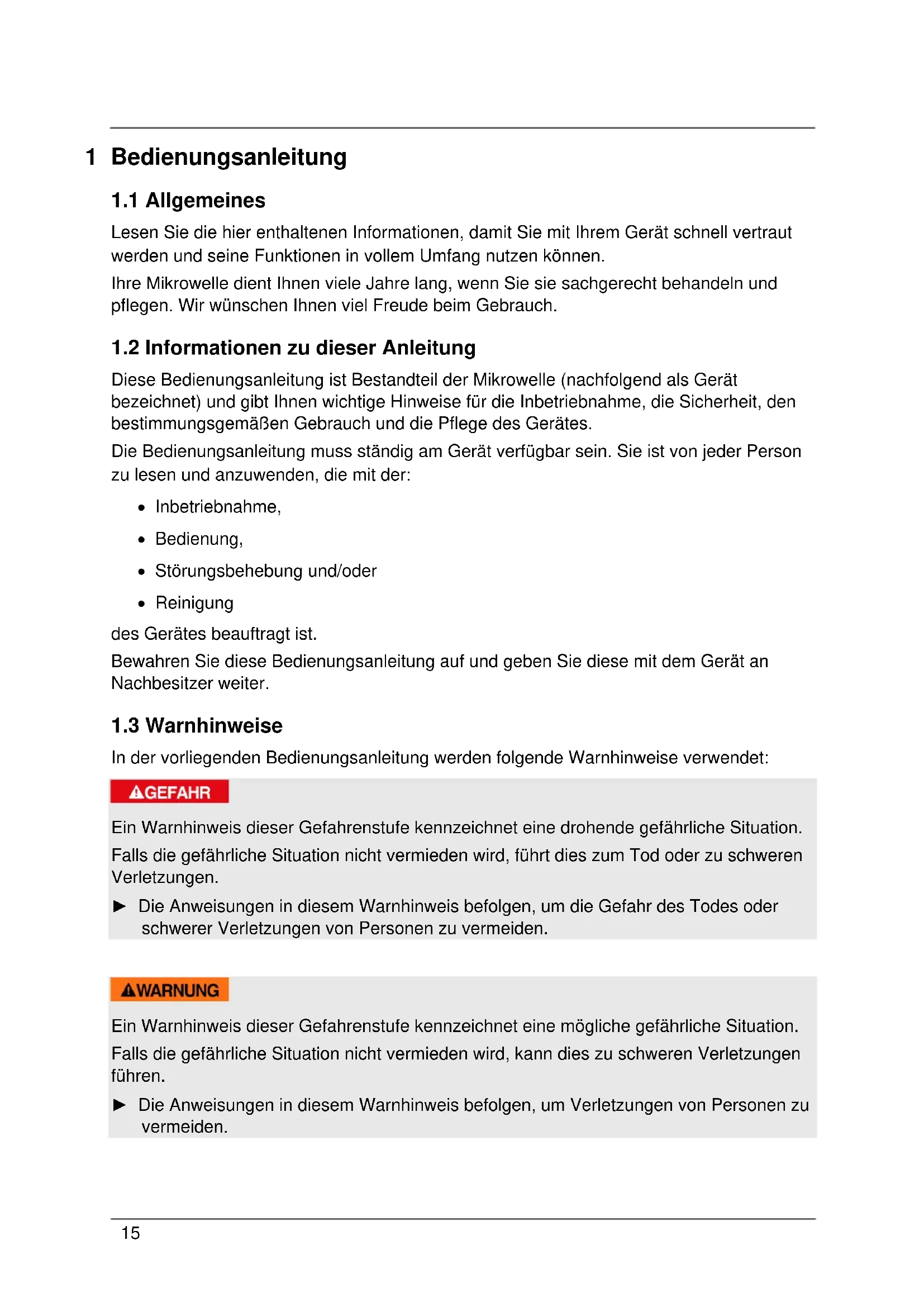 Diese Bedienungsanleitung ist Bestandteil der Mikrowelle (nachfolgend als Gerät bezeichnet) und gibt Ihnen wichtige Hinweise für die Inbetriebnahme, die Sicherheit, den bestimmungsgemäßen Gebrauch und die Pflege des Gerätes. Die Bedienungsanleitung muss ständig am Gerät verfügbar sein. Sie ist von jeder Person zu lesen und anzuwenden, die mit der: