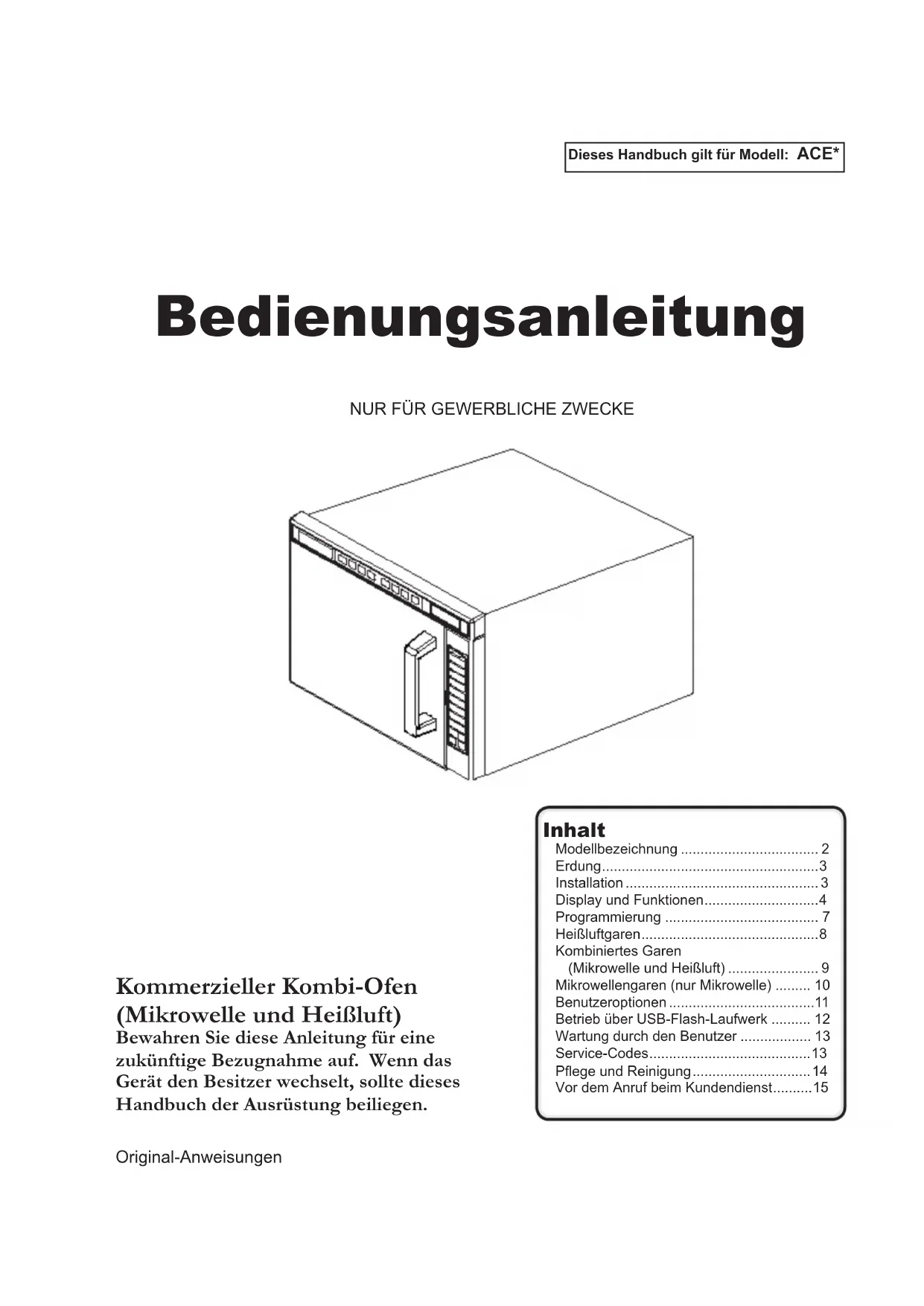 - Verwenden Sie den Ofen erst nach Kontaktaufnahme zum ACP- Servicefachmann. (Beispiel)14 Eine regelmäßige Reinigung gewährleistet eine maximale Lebensdauer, Leistung und Efzienz des Ofens. Ein verschmutzter Ofen gart nicht gut, da Feuchtigkeit, Flecken und Fett die Heißluft und Mikrowellenenergie absorbieren. Pege und Reinigung Um schwere Verletzungen und Tod durch Stromschläge zu vermeiden, ziehen Sie den Netzstecker oder öffnen Sie den Schutzschalter, bevor Sie den Ofen reinigen.
