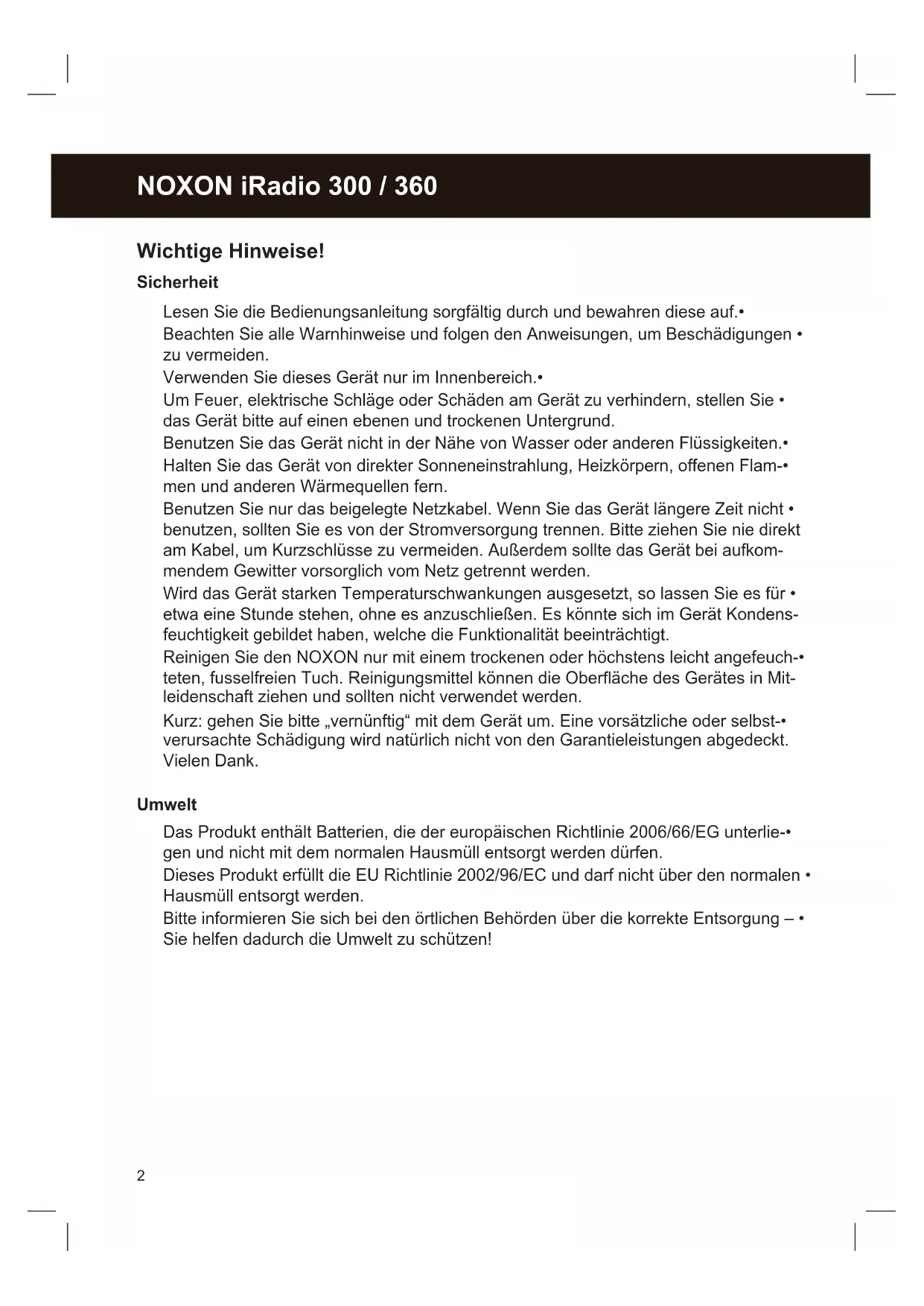 Wichtige Hinweise! Sicherheit Lesen Sie die Bedienungsanleitung sorgfältig durch und bewahren diese auf.• Beachten Sie alle Warnhinweise und folgen den Anweisungen, um Beschädigungen • zu vermeiden. Verwenden Sie dieses Gerät nur im Innenbereich.• Um Feuer, elektrische Schläge oder Schäden am Gerät zu verhindern, stellen Sie • das Gerät bitte auf einen ebenen und trockenen Untergrund. Benutzen Sie das Gerät nicht in der Nähe von Wasser oder anderen Flüssigkeiten.• Halten Sie das Gerät von direkter Sonneneinstrahlung, Heizkörpern, offenen Flam-• men und anderen Wärmequellen fern. Benutzen Sie nur das beigelegte Netzkabel. Wenn Sie das Gerät längere Zeit nicht • benutzen, sollten Sie es von der Stromversorgung trennen. Bitte ziehen Sie nie direkt am Kabel, um Kurzschlüsse zu vermeiden. Außerdem sollte das Gerät bei aufkom- mendem Gewitter vorsorglich vom Netz getrennt werden. Wird das Gerät starken Temperaturschwankungen ausgesetzt, so lassen Sie es für • etwa eine Stunde stehen, ohne es anzuschließen. Es könnte sich im Gerät Kondens- feuchtigkeit gebildet haben, welche die Funktionalität beeinträchtigt. Reinigen Sie den NOXON nur mit einem trockenen oder höchstens leicht angefeuch-• teten,fusselfreienTuch.ReinigungsmittelkönnendieOberächedesGerätesinMit- leidenschaft ziehen und sollten nicht verwendet werden. Kurz: gehen Sie bitte „vernünftig“ mit dem Gerät um. Eine vorsätzliche oder selbst-• verursachte Schädigung wird natürlich nicht von den Garantieleistungen abgedeckt. Vielen Dank. Umwelt Das Produkt enthält Batterien, die der europäischen Richtlinie 2006/66/EG unterlie-• gen und nicht mit dem normalen Hausmüll entsorgt werden dürfen. Dieses Produkt erfüllt die EU Richtlinie 2002/96/EC und darf nicht über den normalen • Hausmüll entsorgt werden. Bitte informieren Sie sich bei den örtlichen Behörden über die korrekte Entsorgung – • Sie helfen dadurch die Umwelt zu schützen!English Nederlands Espanol Italiano Francais DeutschEnglish