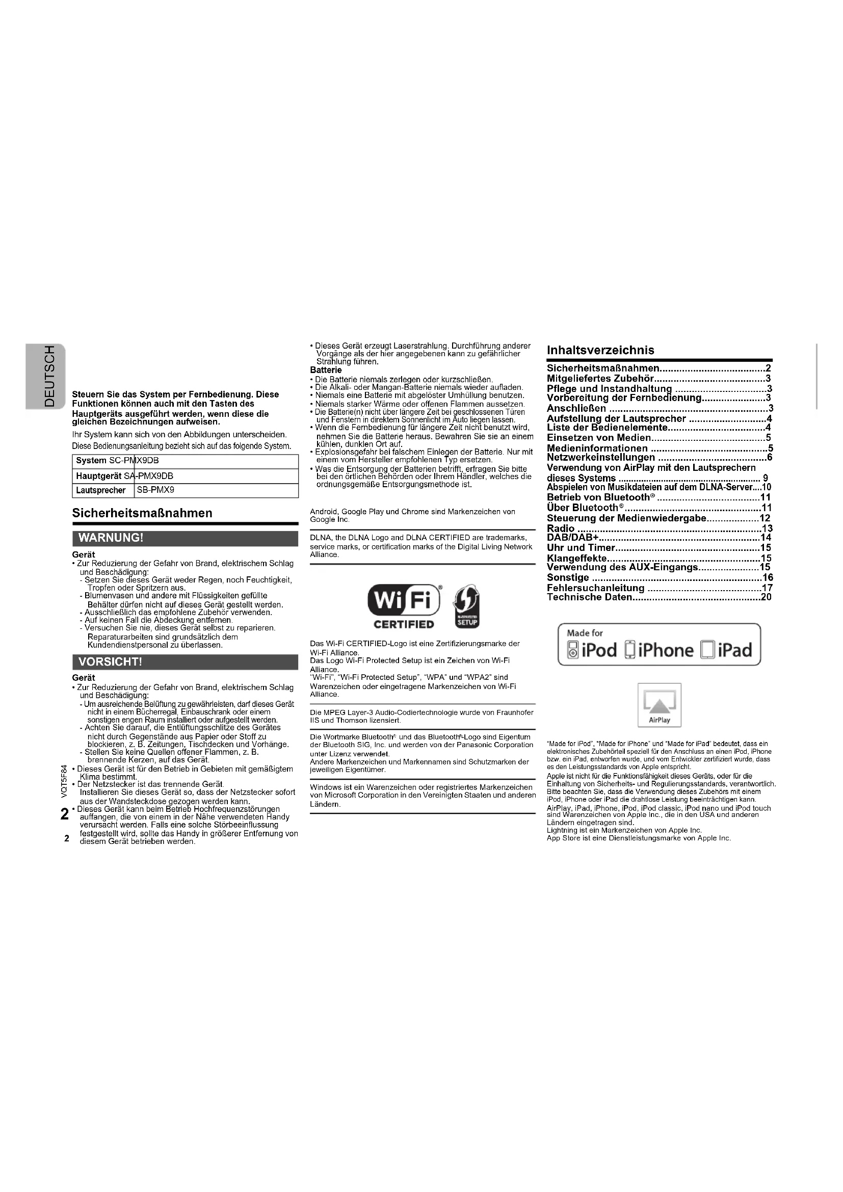 - Technische Daten “Made for iPod”, “Made for iPhone” und “Made for iPad” bedeutet, dass ein elektronisches Zubehörteil speziell für den Anschluss an einen iPod, iPhone bzw. ein iPad, entworfen wurde, und vom Entwickler zertifiziert wurde, dass es den Leistungsstandards von Apple entspricht.Apple ist nicht für die Funktionsfähigkeit dieses Geräts, oder für die Einhaltung von Sicherheits- und Regulierungsstandards, verantwortlich.Bitte beachten Sie, dass die Verwendung dieses Zubehörs mit einem iPod, iPhone oder iPad die drahtlose Leistung beeinträchtigen kann.AirPlay, iPad, iPhone, iPod, iPod classic, iPod nano und iPod touch sind Warenzeichen von Apple Inc., die in den USA und anderen Ländern eingetragen sind.Lightning ist ein Markenzeichen von Apple Inc.App Store ist eine Dienstleistungsmarke von Apple Inc.System SC-PMX9DBHauptgerät SA-PMX9DBLautsprecherSB-PMX9 WARNUNG! VORSICHT! SC-PMX9DBEG-VQT5F84.book 2 ページ 2014年1月17日 金曜日 午後6時4分3 p. 20