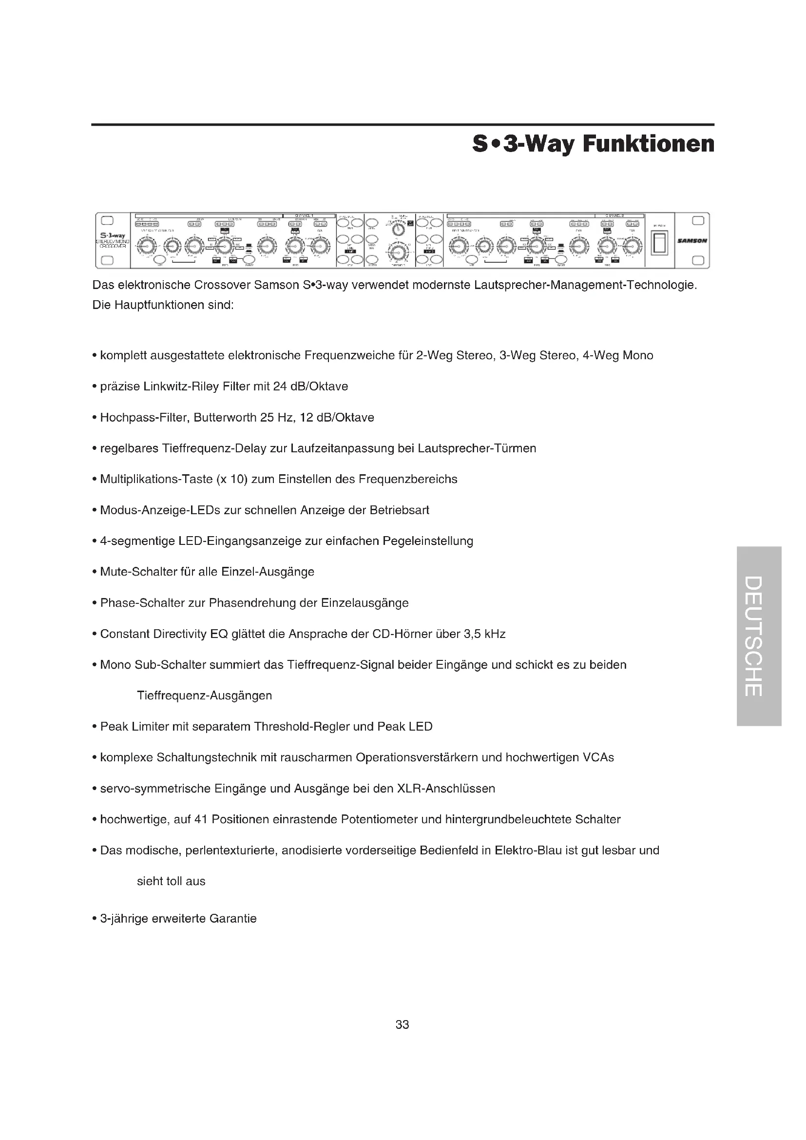 FRANÇAIS33 S•3-Way Funktionen Das elektronische Crossover Samson S•3-way verwendet modernste Lautsprecher-Management-Technologie. Die Hauptfunktionen sind: