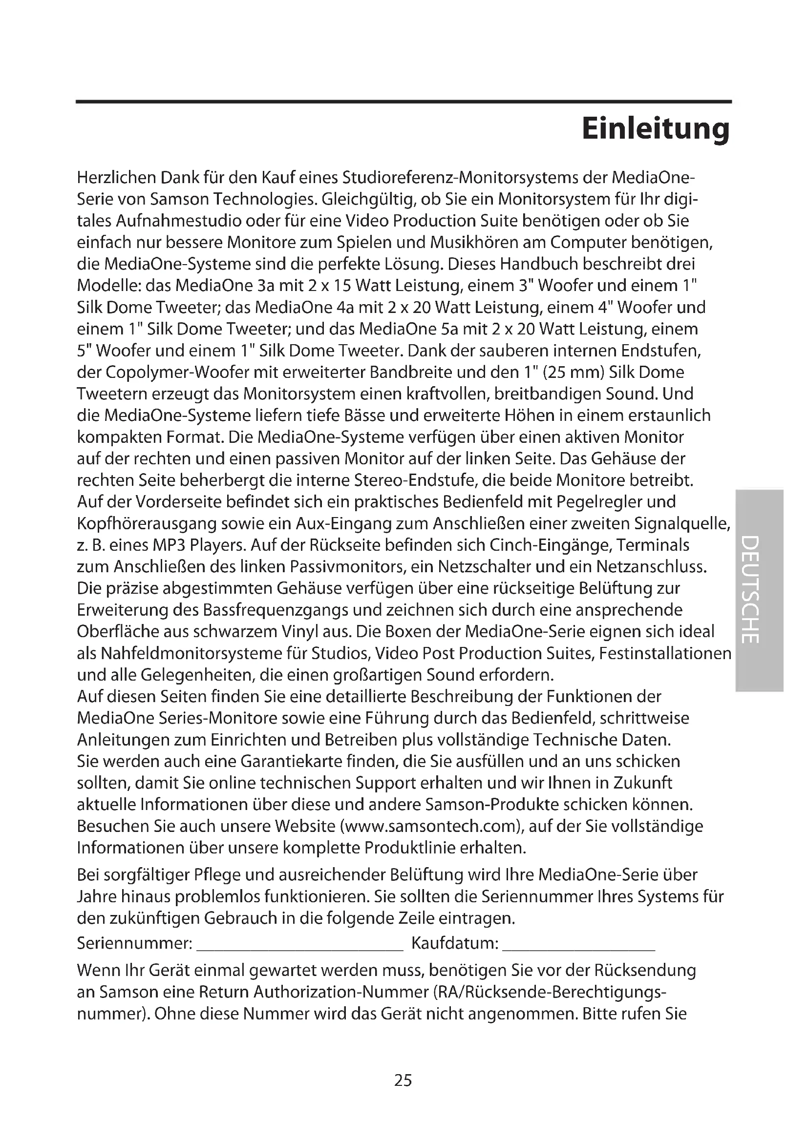 Auf diesen Seiten finden Sie eine detaillierte Beschreibung der Funktionen der MediaOne Series-Monitore sowie eine Führung durch das Bedienfeld, schrittweise Anleitungen zum Einrichten und Betreiben plus vollständige Technische Daten. Sie werden auch eine Garantiekarte finden, die Sie ausfüllen und an uns schicken sollten, damit Sie online technischen Support erhalten und wir Ihnen in Zukunft aktuelle Informationen über diese und andere Samson-Produkte schicken können. Besuchen Sie auch unsere Website (www.samsontech.com), auf der Sie vollständige Informationen über unsere komplette Produktlinie erhalten.