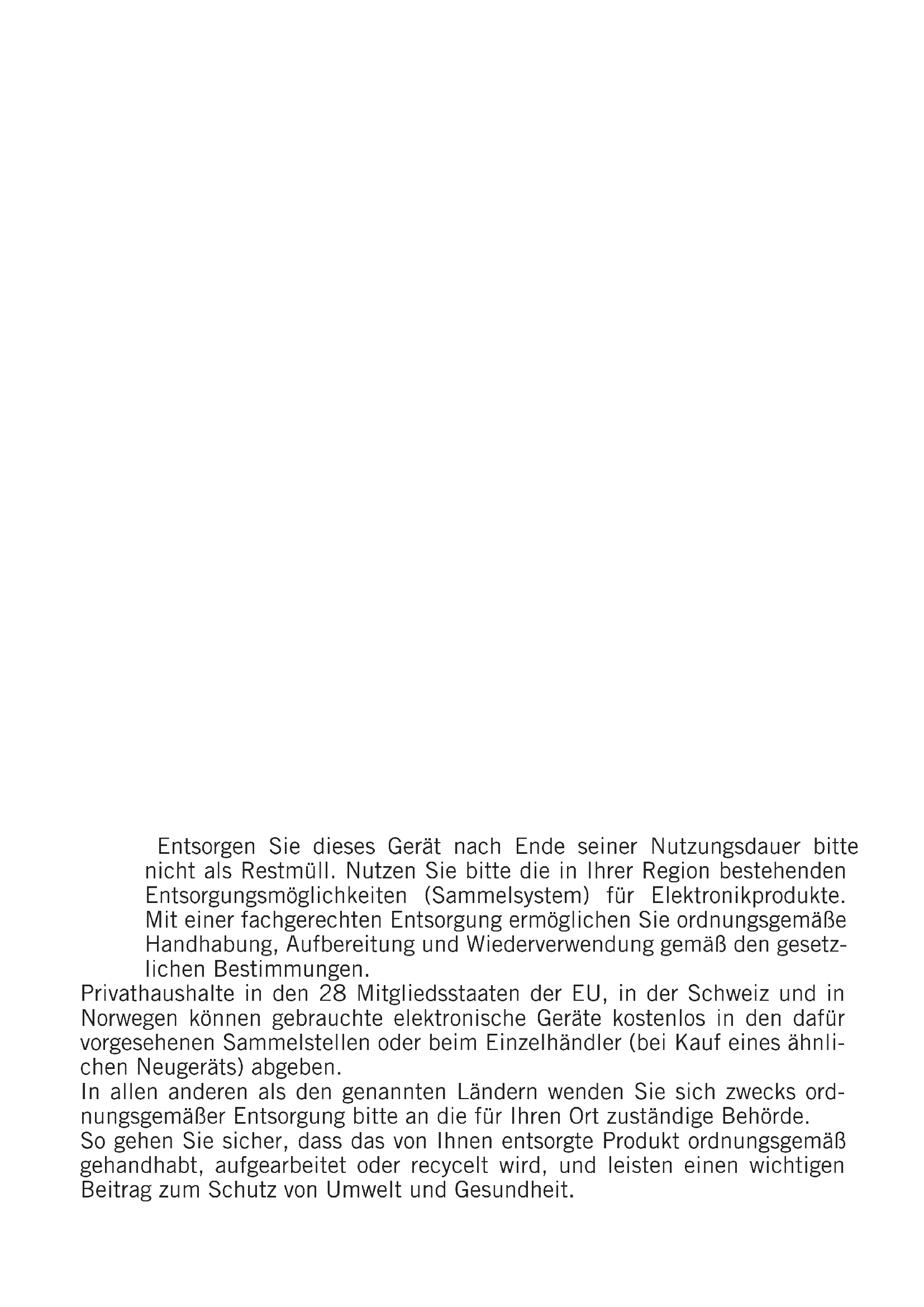 Entsorgen Sie dieses Gerät nach Ende seiner Nutzungsdauer bitte nicht als Restmüll. Nutzen Sie bitte die in Ihrer Region bestehenden Entsorgungsmöglichkeiten (Sammelsystem) für Elektronikprodukte. Mit einer fachgerechten Entsorgung ermöglichen Sie ordnungsgemäße Handhabung, Aufbereitung und Wiederverwendung gemäß den gesetzlichen Bestimmungen.